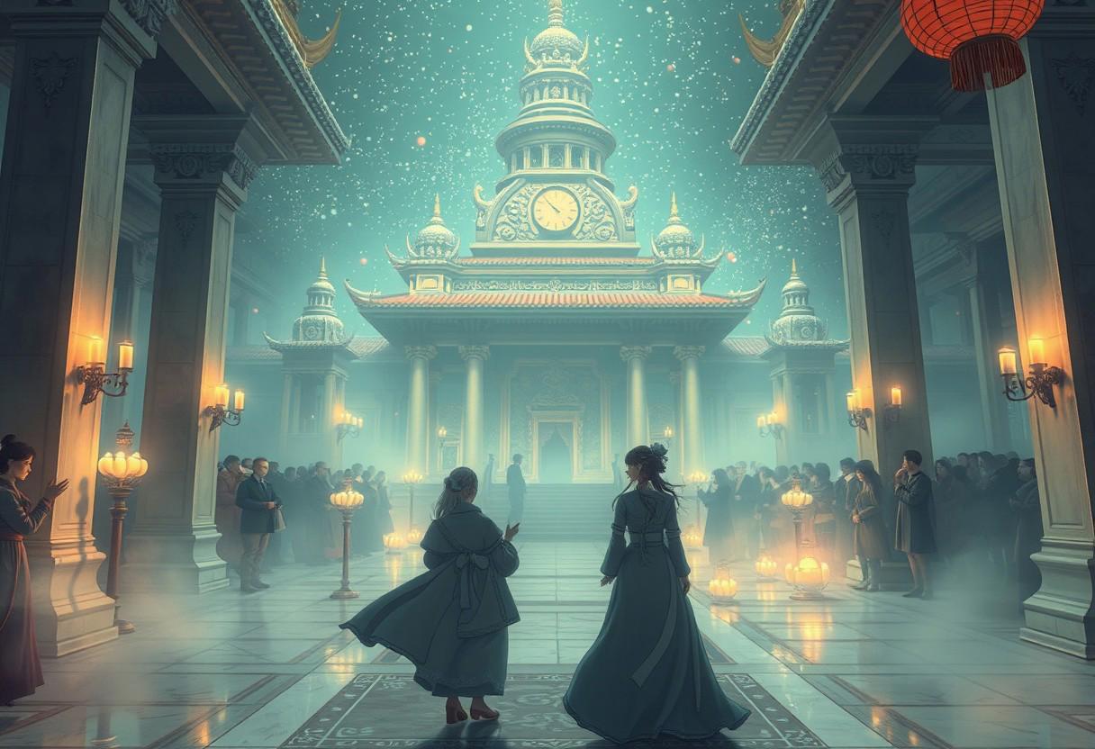 love for the beaty God, love vintage anime style, An anime-style illustration, up-scaled, in a Vintage love tempel of the beaty god, white marmor walkways, wh40k, happy, candle light, traditional party mixed with love parade. Fine mist and dust particles. Low-angle, cinematic, emotionally banging and empowering, contrastfull color grading, textured details. detailed line art, 3D style, anime shading