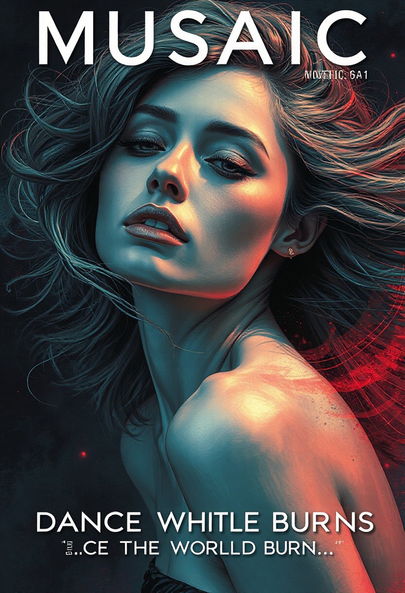 high quality design aesthetics, disco, synth pop, dynamic, detailed, pop album cover, melancholic, beautiful young white woman, artist name "MUSAIC", album title "Dance While The World Burns"