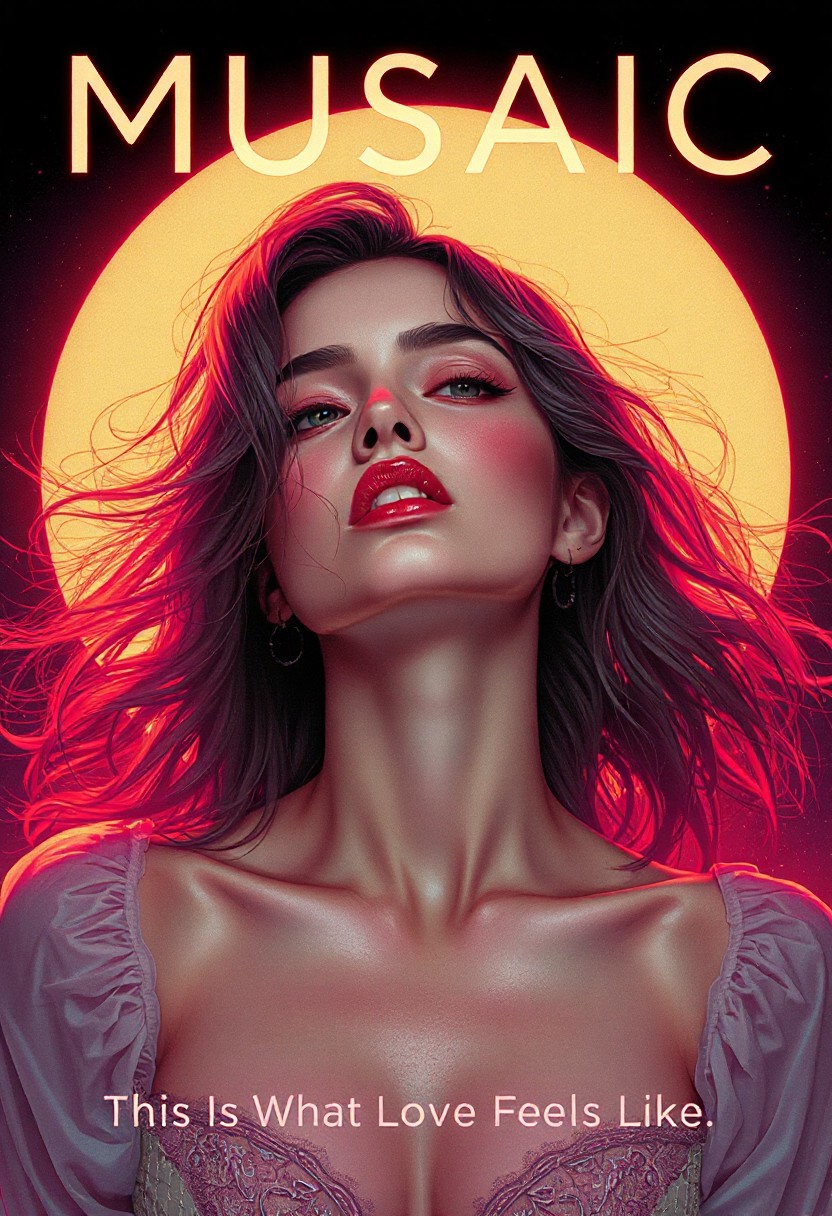 high quality design aesthetics, disco, synth pop, dynamic, detailed, pop album cover, melancholic, beautiful young white woman, artist name "MUSAIC", album title "This Is What Love Feels Like"