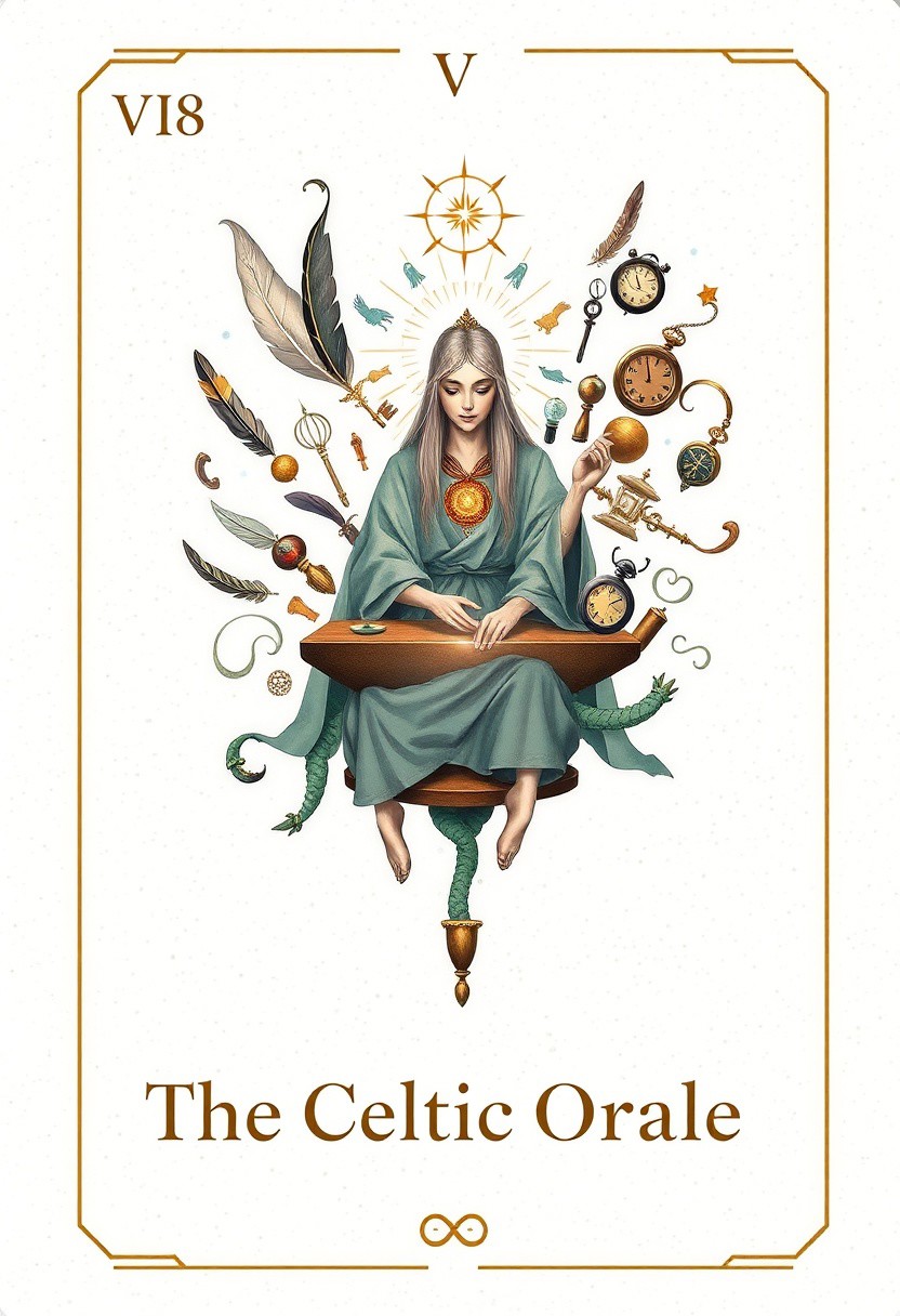 A modern tarot card with refined, clean edges and a lightly textured ivory background. At the center, an otherworldly artisan The Celtic Oracle sits at a floating anvil surrounded by drifting memory-objects: glowing feathers, keys, masks, and ticking clocks. They have a radiant third eye and wear soft, iridescent robes. Dream vapor curls from their fingers into the shape of forgotten cities. The Roman numeral “VIII” appears in the bottom left corner in subtle bronze ink. The title “The Celtic Oracle” is written in clean serif typeface in the bottom right corner. Minimal border with alchemical accents in muted metallics. Ethereal, mystical, clean tarot design, soft brushwork, high detail, painterly fantasy style.