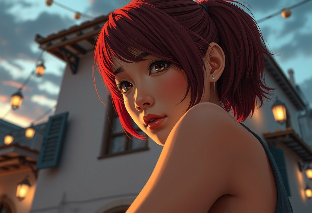 professional cgi anime style, up-scaled, close-up, low, angle, tanned skin asian woman, midlife, sporty, short red hair, natural skin, no make-up, dreaming looking in the camera, leaning on a wall, of a house, in a mediteranian town, late after sunset, fine clouds, dimm lanterns, warm color grading, detailed line art, hyper detailed, surreal,
