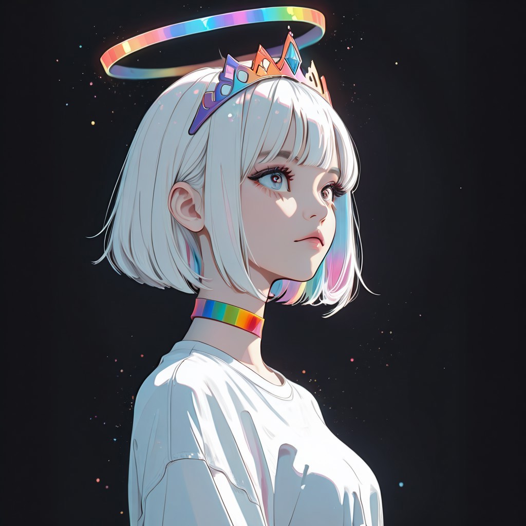 Semireal, semirealistic, masterpiece, best quality, absurdes, simple black background, rainbow side lighting, shoulder up, from side, cel shading:1.3, western art /(style/), (straight on), 1girl, looking to the side, large eyes, rainbow iris, rainbow halo, bob cut, white hair, tiara, rainbow choker, white tshirt