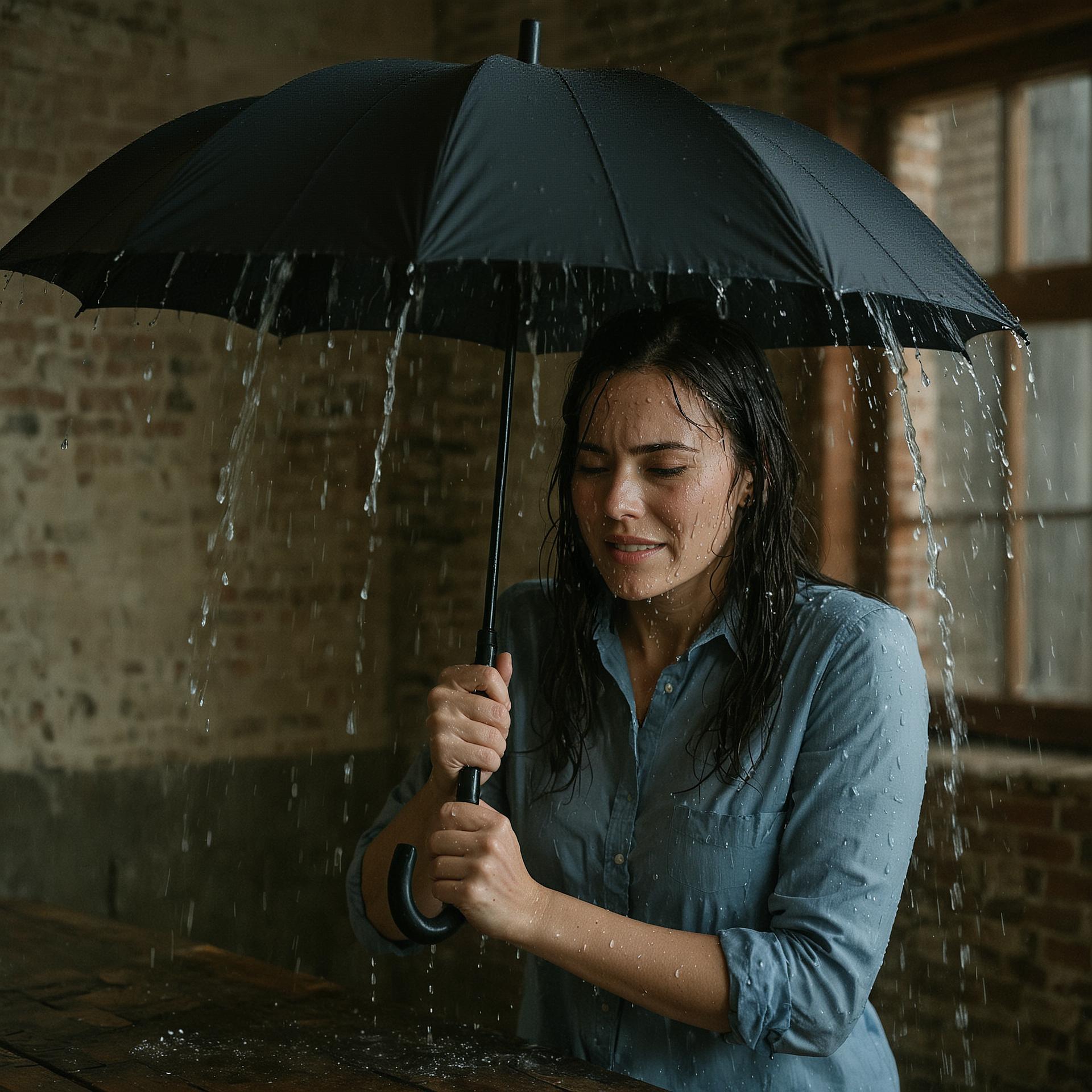 A young woman stands indoors, having just opened a large black umbrella. To her shock, water pours from the inside of the umbrella, drenching her completely. She squints and cringes as the water cascades down her head and shoulders. Her light blue shirt is soaked, clinging to her skin. The room around her is softly lit, with warm wooden window frames and exposed brick walls. The mood is surreal and humorous, a visual play on the superstition that opening an umbrella indoors brings bad luck — in this case, instant and wet.
