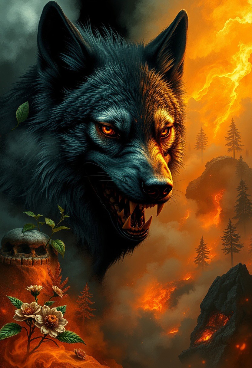 Highly detailed, left hand side white smoke and fog/right hand side lava fire and ashes highly cinematic, close-up image of a goddess wolf over the fractal fog world, perfect composition, dark colours, green leaves, forest, lots of details, flowers, metallic ink, beautifully lit, fire and smoke, a fine art painting by drew struzan and karol bak, gothic art, dark and mysterious, in the playful scribble drawing style. triadic complementary colors, dark and moody surreal nightmare of an eerie laugh, a mouth distorted, wide grin, and full of sharp nails, in the realm of the damned dreaded souls, teal and orange color grading, yellow abstract geometric gradients stain the orangish background