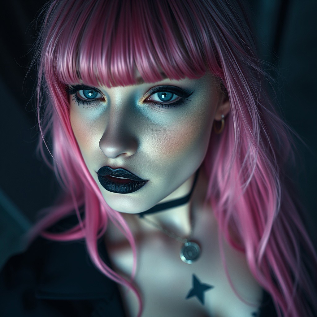 A 20-year-old woman with gothic makeup. Long silky neon pink hair, big blue eyes with thin eyebrows, black lips, small upturned nose. She is the image of a seductive gothic succubus. She exudes a bewitching aura. Ultra-detailed facial details, innocent and playful, soft light glowing, soft incandescent. Staring into the distance. Grey and blue tones, misty atmosphere. Sexy and seductive playful, sexy emo outfit, revealing breasts and some neck and chest tattoos. Her detailed face surrounded by disheveled hair radiates innocence and beauty. Cinematic composition, contrast of light and shadow, adorable bold and detailed face, realistic and fantastical woman, ((full body shot of an attractive woman, view from above, large breasts, deep cleavage, sideboob, very sexy)), Detailed facial texture, ultra-detailed eye and hair details, 8K+ high resolution photos are all showcased.