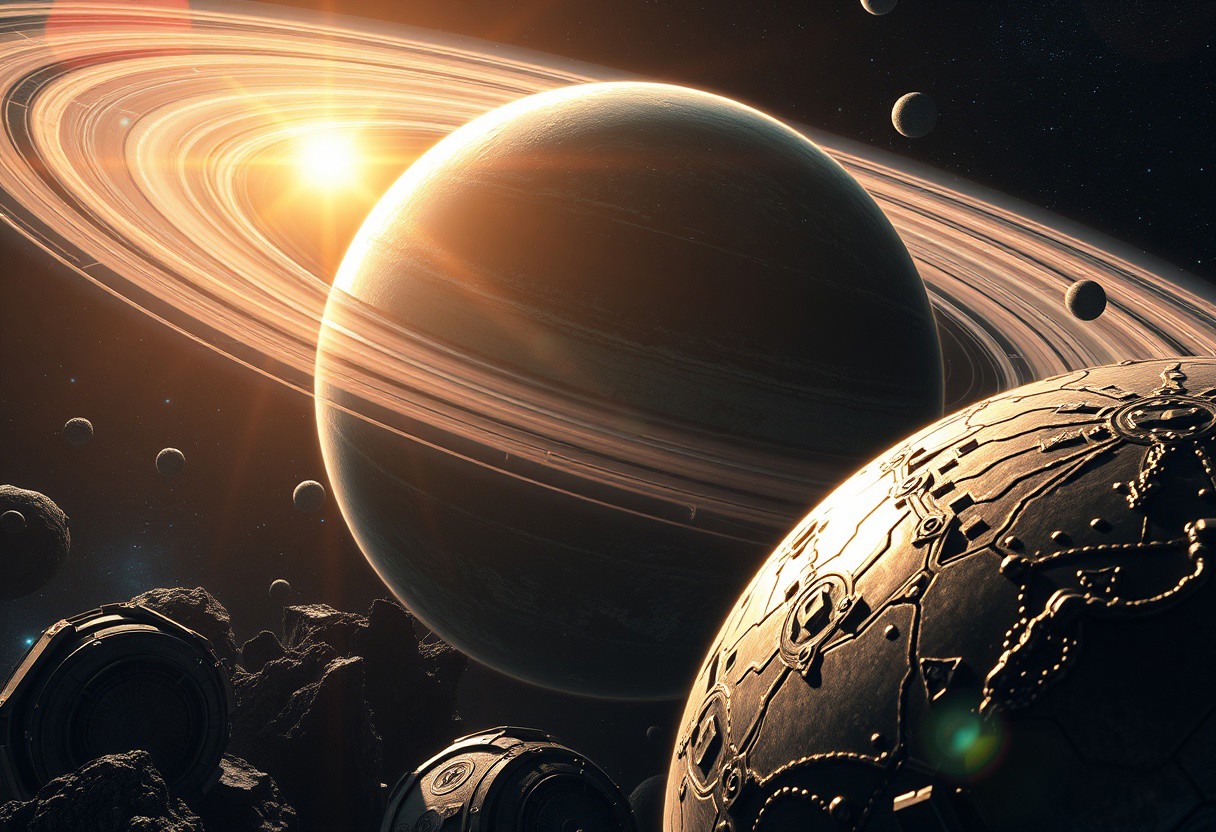 "A Solar system, Heliosphere, Heliopause, Artifical metallic planets, galaxy suturation background, Realistic Lighting, cinematic scene, dramatic lens flare, cinematic atmosphere. Hyper-realistic, 3D render, 4K resolution. Cinematic lighting brings out the depth and detail in every engraving, armor texture, and metallic surface, with a subtle film grain overlay that adds realism and texture."