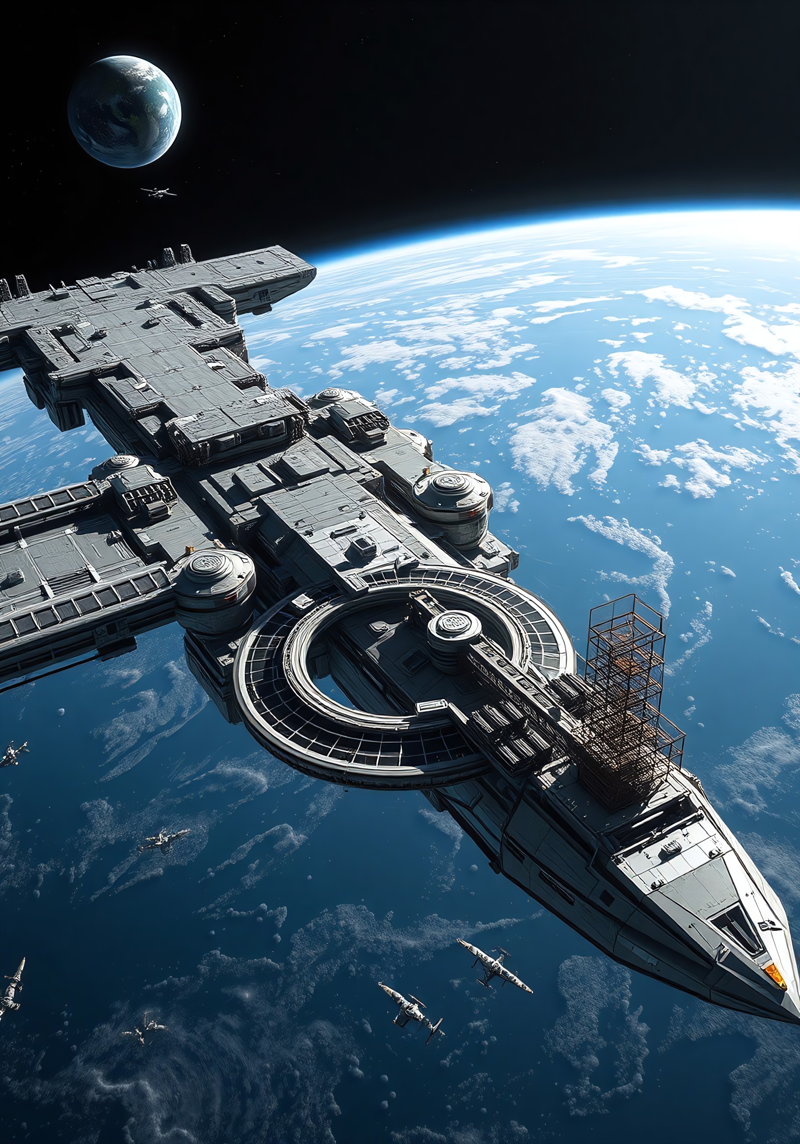 A colossal orbital space dock floats above Earth in high orbit, designated as "Orbital Forge." This C1-tier modular station spans over 15 kilometers, anchored at Lagrange Point L1. Massive drydock arms extend outward like giant mechanical spines, capable of servicing and constructing spacecraft up to 10 kilometers in length. Hexagonal docking ports, magnetic mooring clamps, and articulated gantry cranes dominate the structure's frame. Below, solar array fields shimmer, powering fusion-based infrastructure and AI-directed robotics. A rotating gravity ring, 500 meters in diameter, spins slowly at the end of a central truss, housing over 1,000 crew members. Cargo pods, drones, and utility skimmers dart between modular habitat bays, industrial tanks, and scaffolded ship skeletons under construction. Earth hangs immense and blue in the background, while the Sun casts harsh glints on metallic surfaces and glowing thruster ports. Style: realistic sci-fi, cinematic space epic, sharp structural detail, wide angle view.