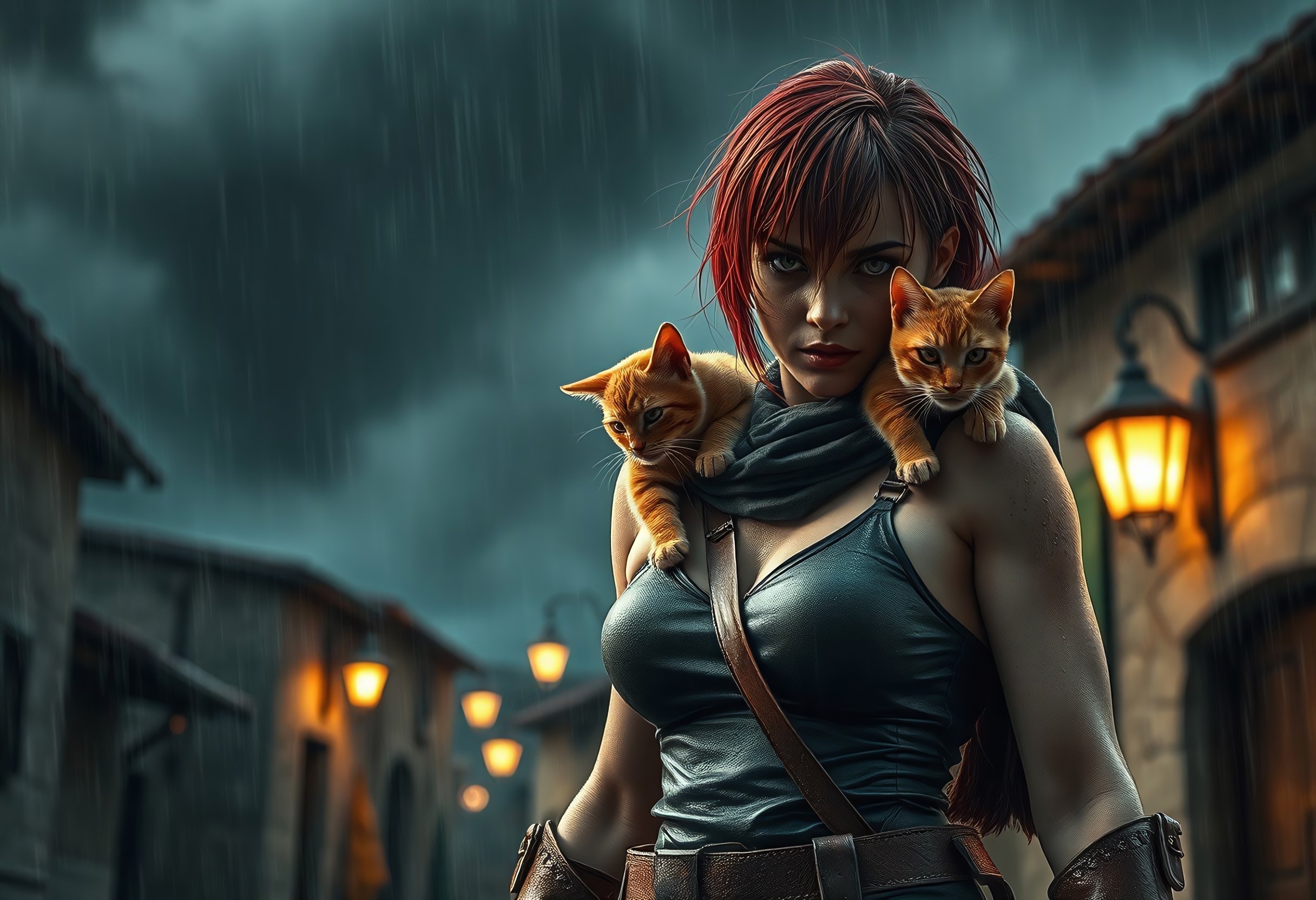 s0r0r1t@s, full body shot, Cinematic low-angle shot of a WH40k Sororitas, energetic walking in a small Mediterranean town under a heavy rainstorm. a small orange cat on her shoulder. She has a strong yet feminine athletic build, short wet red hair clinging to her head and cheeks, water droplets visible on her dirty face. her angry eyes meet the camera. Dramatic night with dark storm clouds filling the sky with some dark red spots, rustic lanterns glow dimly in the background, rain streaks visible in the warm lantern light. Cold dark but warm color grading, fine detail on skin pores and rain, 85 mm lens, f/1.8, high-resolution, photorealistic.