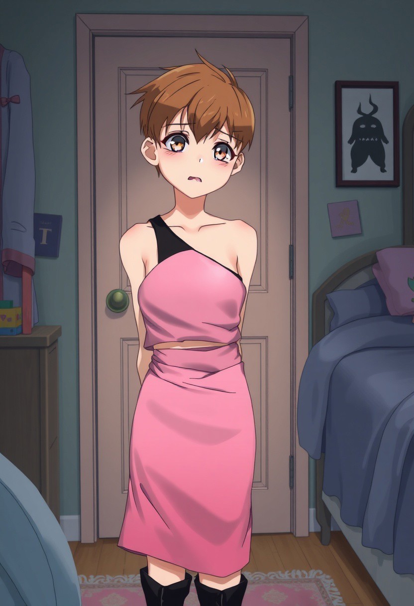 Androgynous preteen boy, wearing pink satin pencil miniskirt, black one-shoulder crop top, high-heeled boots, smudged makeup, in his older sister's room, scared, discovered by sister, anime style