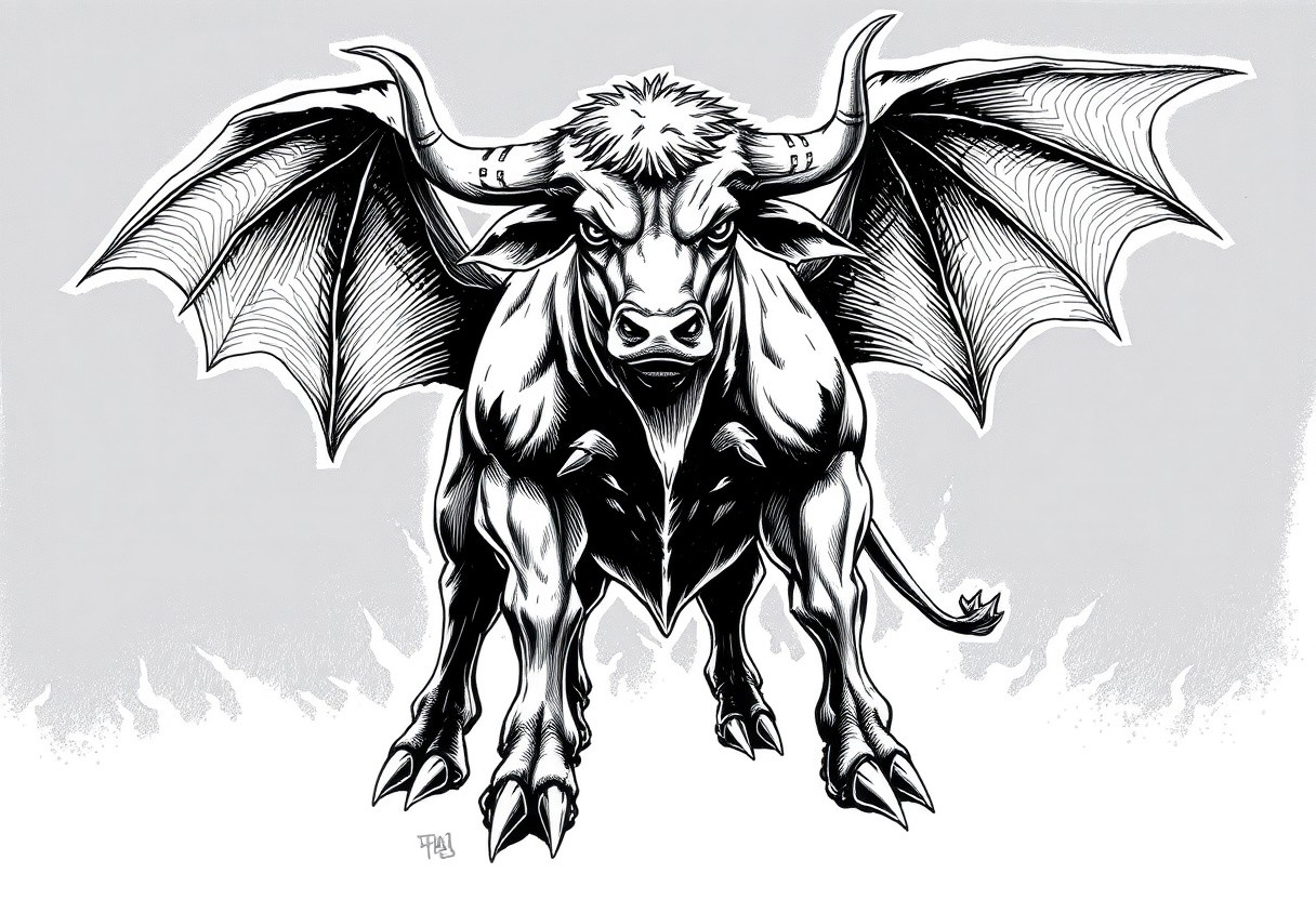 fantasy, ink art, comic style art, bull is standing with four feet, feet has 3 claws, bat wings, muscular