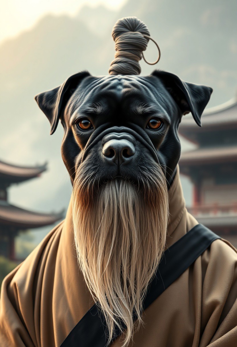 A photorealistic portrait of a black dog with a flat, squashed face, styled like a martial arts master. The dog has a long flowing white beard extending far below its chin, large bushy white eyebrows, and long sideways white whiskers. On top of its head is a traditional topknot bun, resembling Pai Mei from Kill Bill. The dog is wearing traditional East Asian monk robes in neutral tones, with a black sash. It stares directly into the camera with a calm, superior expression. The background is a misty mountain temple scene with warm natural lighting. Vertical 9:16 aspect ratio.