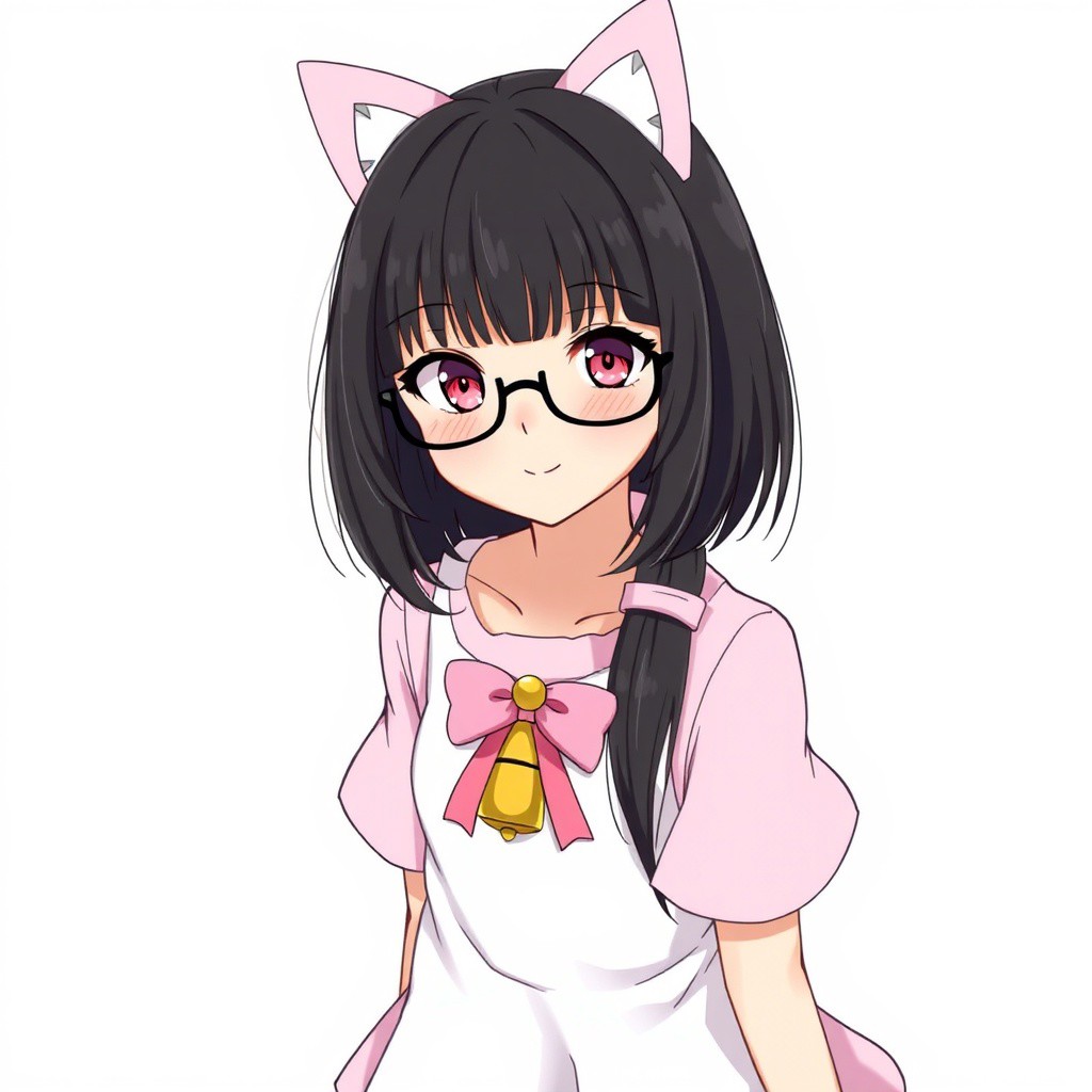 Black hair, short woman, adult, fringe hairstyle, bob hairstyle, anime, black glasses, pink bow, cat ears, yellow bell necklace with pink ribbon, white dress, pink dress, short skirt, flared skirt, full body, stocking feet