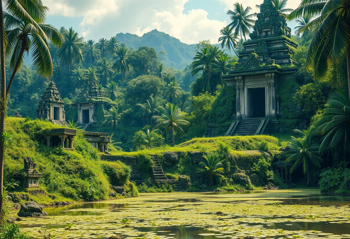 Realistic style. Overgrown monuments of an ancient civilization. There is tropical vegetation and a lake. The scene is vibrant and idyllic. Masterpiece,best quality,hi res,8k,hi res,8k,award winning,(sharp focus, intricate, highly detailed)
