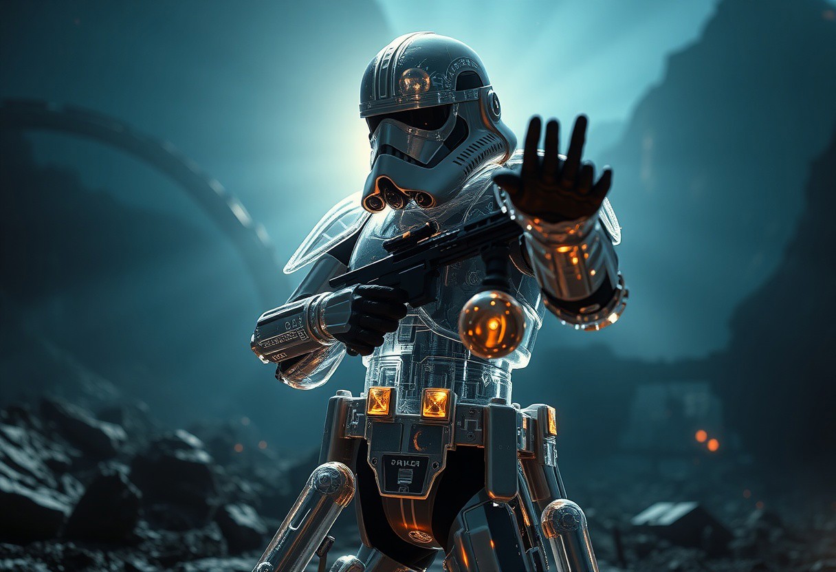Ultra-detailed 4K rendering: Translucent Chrono-Patrol Trooper (Star Wars stormtrooper concept) made of crystalline metal, revealing intricate internal mechanisms. Dynamic action pose, poised for combat. Set against a World Legacy in Shadow background, ruined ancient landscape, deep atmospheric shadows. Dramatic cinematic backlighting, ethereal light shafts, vibrant spectral highlights. Octane Render, Unreal Engine 5, hyperrealistic, intricate, golden ratio composition, creative low angle, masterpiece, trending on ArtstationHQ, CGSociety.