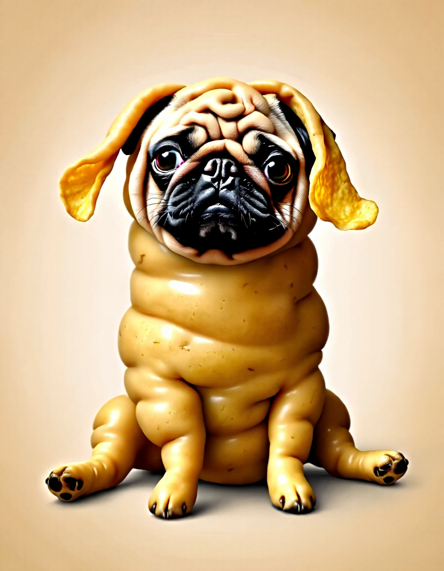 In a culinary twist, a pug dog is transformed into a potato, and the wrinkled skin of the dog looks like it is potato skin, the head looks like potato, and droopy ears look like potato chips. Imagine a potato pug.