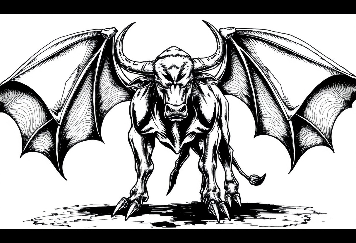 fantasy, ink art, comic style art, bull is standing with four feet, feet has 3 claws, bat wings, muscular