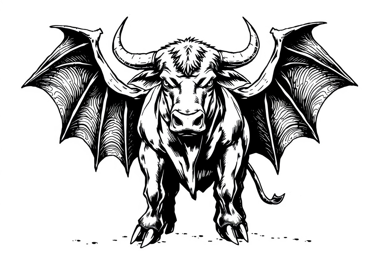fantasy, ink art, comic style art, bull is standing with four feet, feet has claws, bat wings