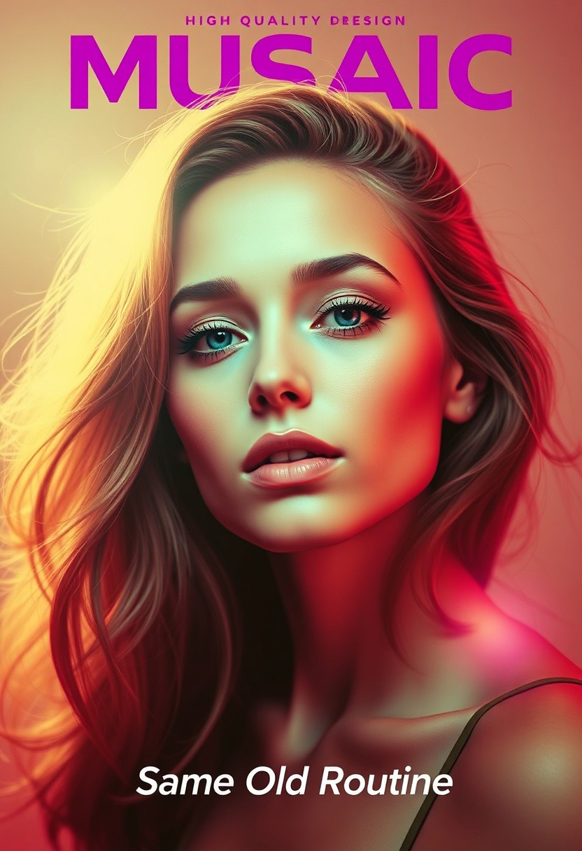 high quality design aesthetics, disco, synth pop, detailed, pop album cover, beautiful young white woman, artist name "MUSAIC", album title "Same Old Routine"