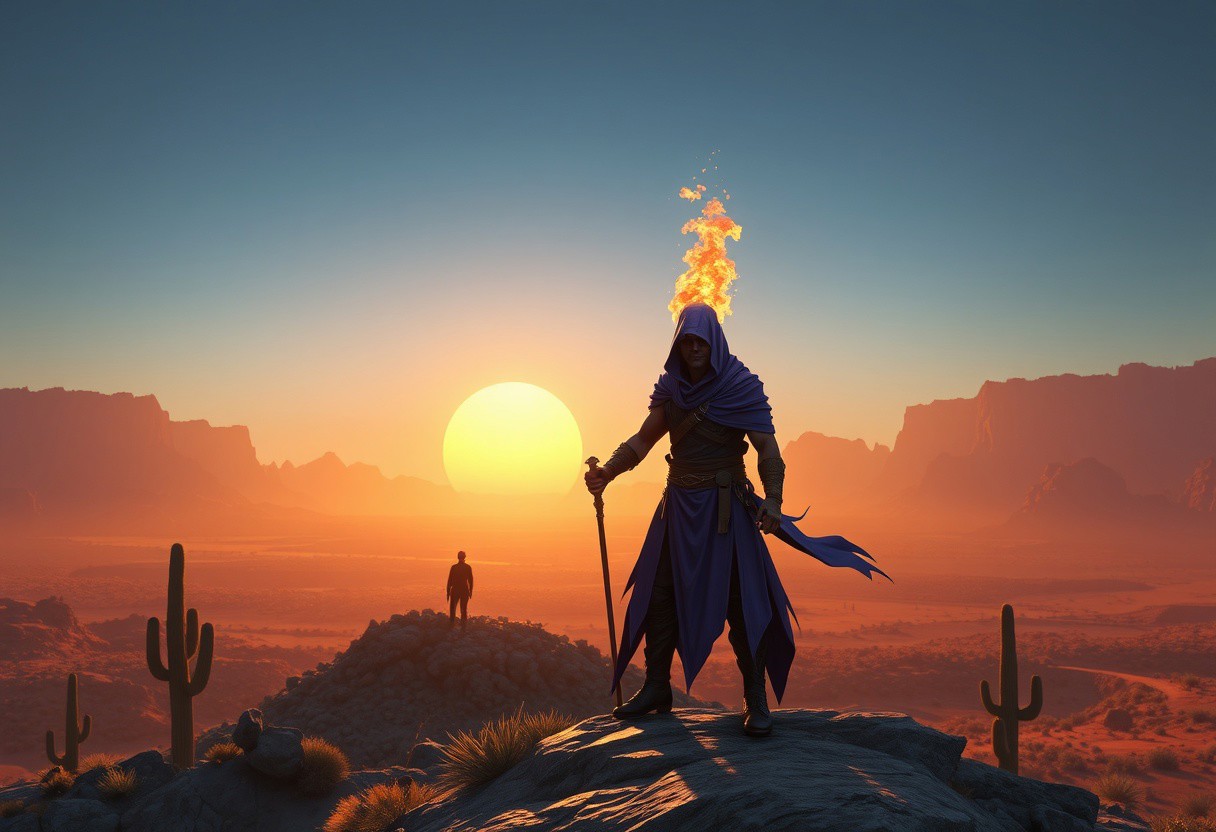 Cinematic fantasy, highly detailed 4K, trending on Artstation, CGSociety. A muscular figure in a purple hooded cloak, face obscured by a Supersonic Skull Flame, holding a staff, stands on a rocky outcropping overlooking a vast desert landscape with mountains and cacti. A large orange sun sets, casting a warm dramatic glow. Two silhouetted figures in the distance add scale. Matte Painting, Octane Render, Unreal Engine 5, impeccable composition, golden ratio, creative angle.