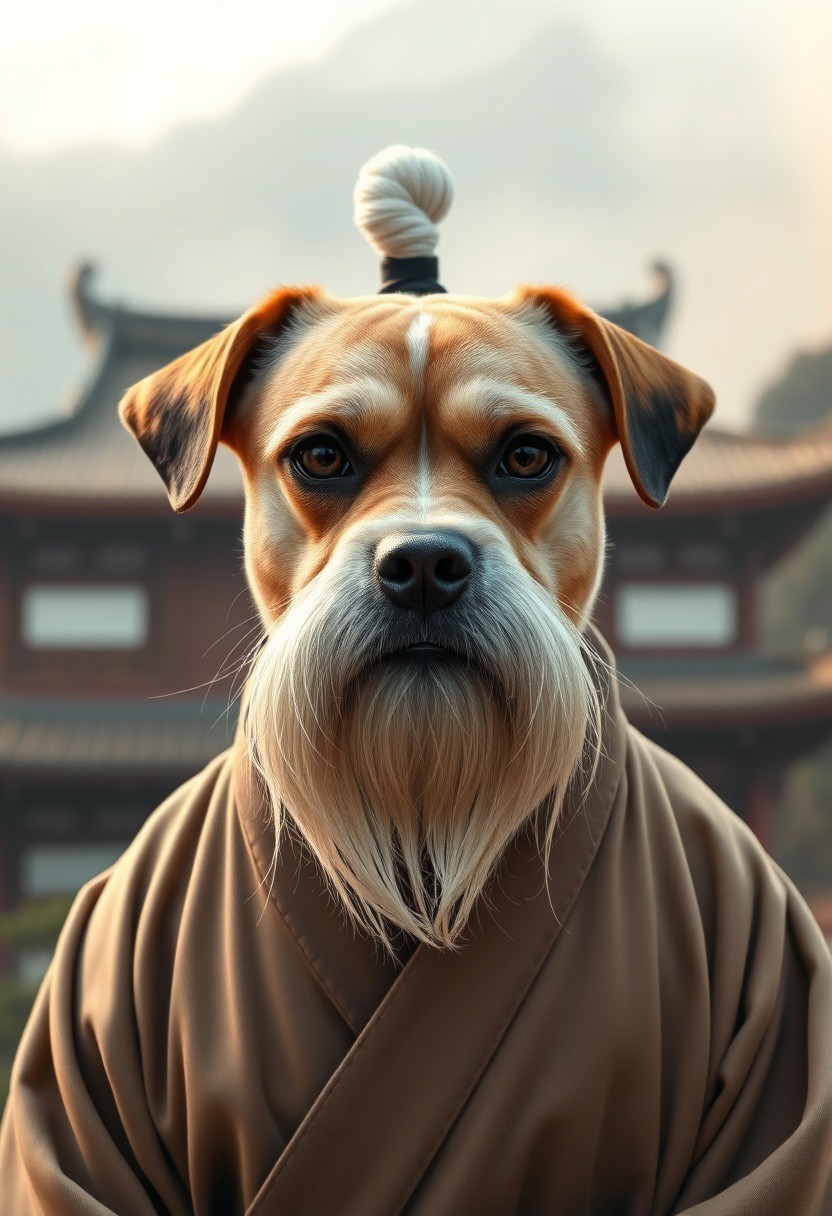 A photorealistic portrait of a dog with a flat, squashed face, styled like a martial arts master. The dog has a long flowing white beard extending far below its chin, large bushy white eyebrows, and long sideways white whiskers. On top of its head is a traditional topknot bun, resembling Pai Mei from Kill Bill. The dog is wearing traditional East Asian monk robes in neutral tones, with a black sash. It stares directly into the camera with a calm, superior expression. The background is a misty mountain temple scene with warm natural lighting. Vertical 9:16 aspect ratio.