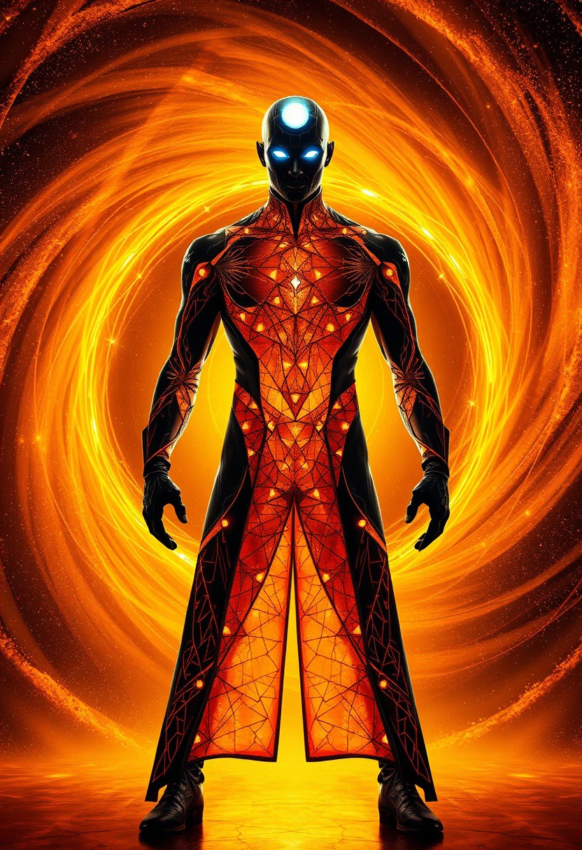 A mysterious humanoid superhero stands confidently in front of a swirling, golden-orange cosmic vortex. The figure is dressed in a sleek, futuristic bodysuit or long coat, composed of intricate glowing geometric patterns, like broken shards of glass forming circuitry. The face is obscured in silhouette, but the eyes and forehead emit a bright, ethereal blue-white glow, suggesting immense quantum energy. The background is a radiant blend of gold, amber, and starfield textures, forming an arcane ring or quantum portal. The visual style is luminous, detailed, and abstract—like a fusion of stained glass and sci-fi tech.