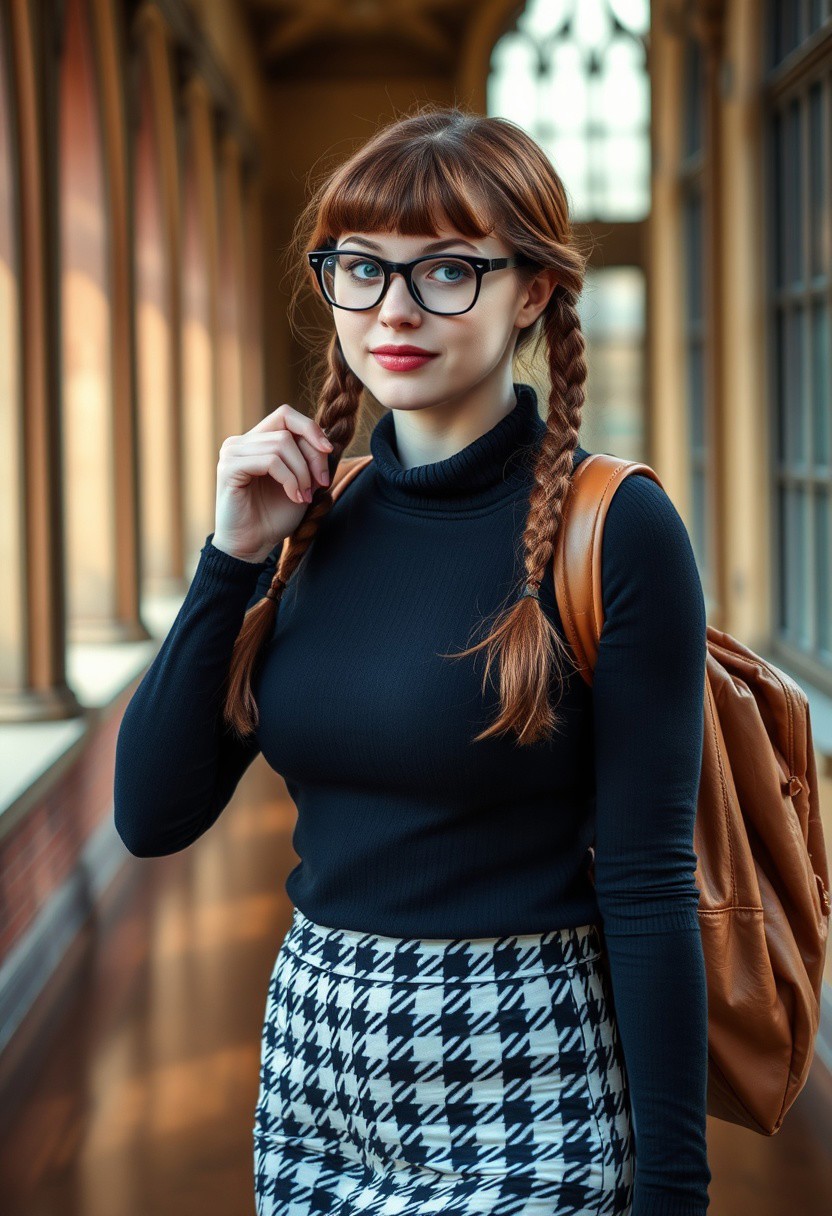 score_9, score_8_up, score_7_up, (realistic:2) , beautiful , masterpiece, thighs up photo, Nerdy 21 year old woman, college girl, nervous, timid, looking slightly to the side, cute round face:0.8, pale white skin, light freckles:0.7, big blue eyes, black rimmed glasses, long shiny brown hair in twin braids with bangs, full pouty lips, lips parted:0.8, teeth visible, naturally red lips, medium firm round breasts:0.8, petite body, wide hips, skinny:0.9, tight black turtleneck sweater stretched tight over her breasts:0.9, knee length black and white houndstooth pencil skirt:0.8, worn leather backpack slung over one shoulder, adjusting her glasses with one hand, walking through hallway of old college, beautiful side lighting from large windows,