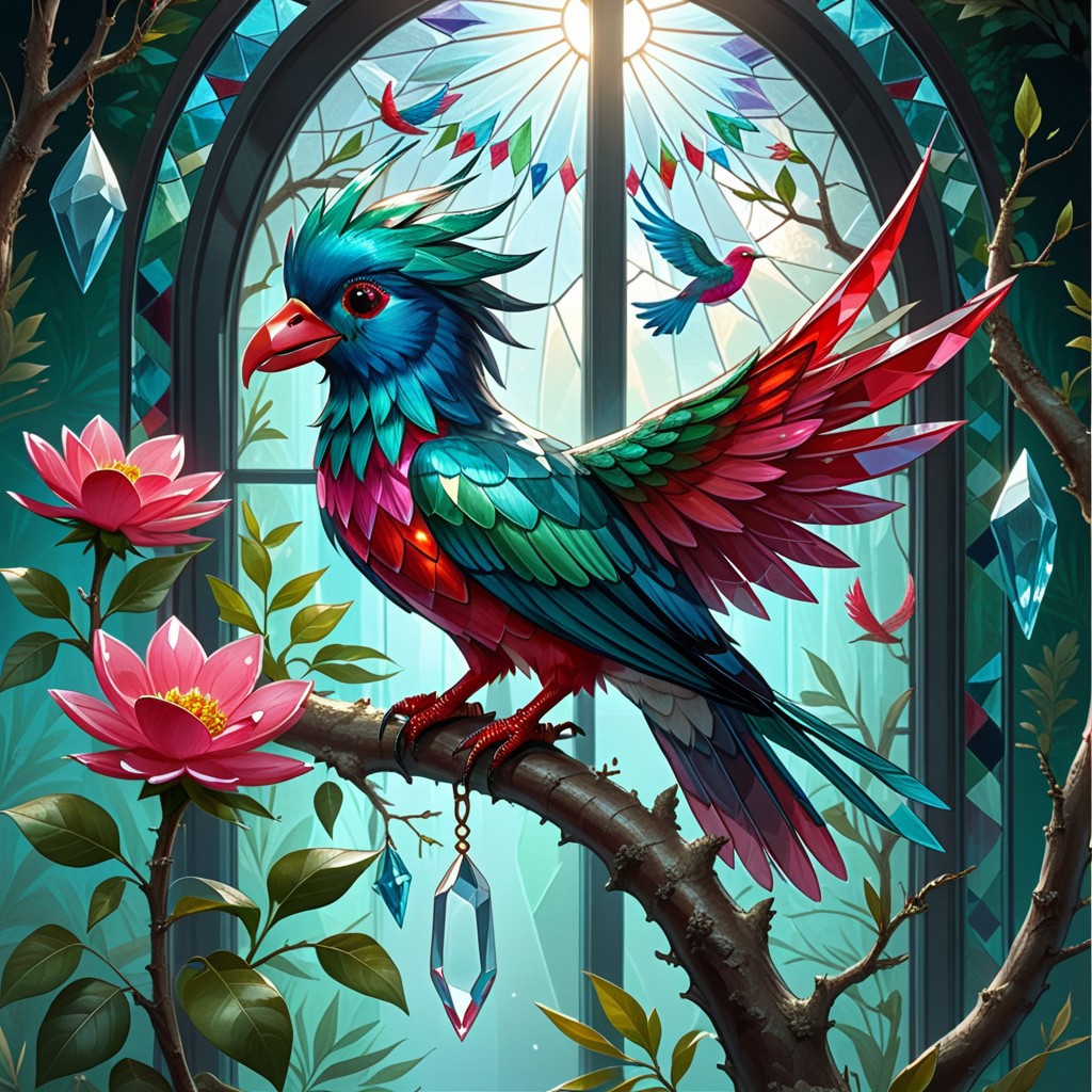 Geometric Pattern Effect: Repeating shapes (tiles, panels) create structured complexity. Color Spectrum Display: Wide range of hues from cool to warm tones. Reflective Surface Theme: Smooth, light-catching textures evoke motion and depth. Symmetry and Balance: Central alignment with mirrored visual weight. . score_9, score_8_up, score_7_up, rp_slgd, quetzal bird, bird on a tree branch, side view, crystal shard, colorful flowers, broken stained glass window