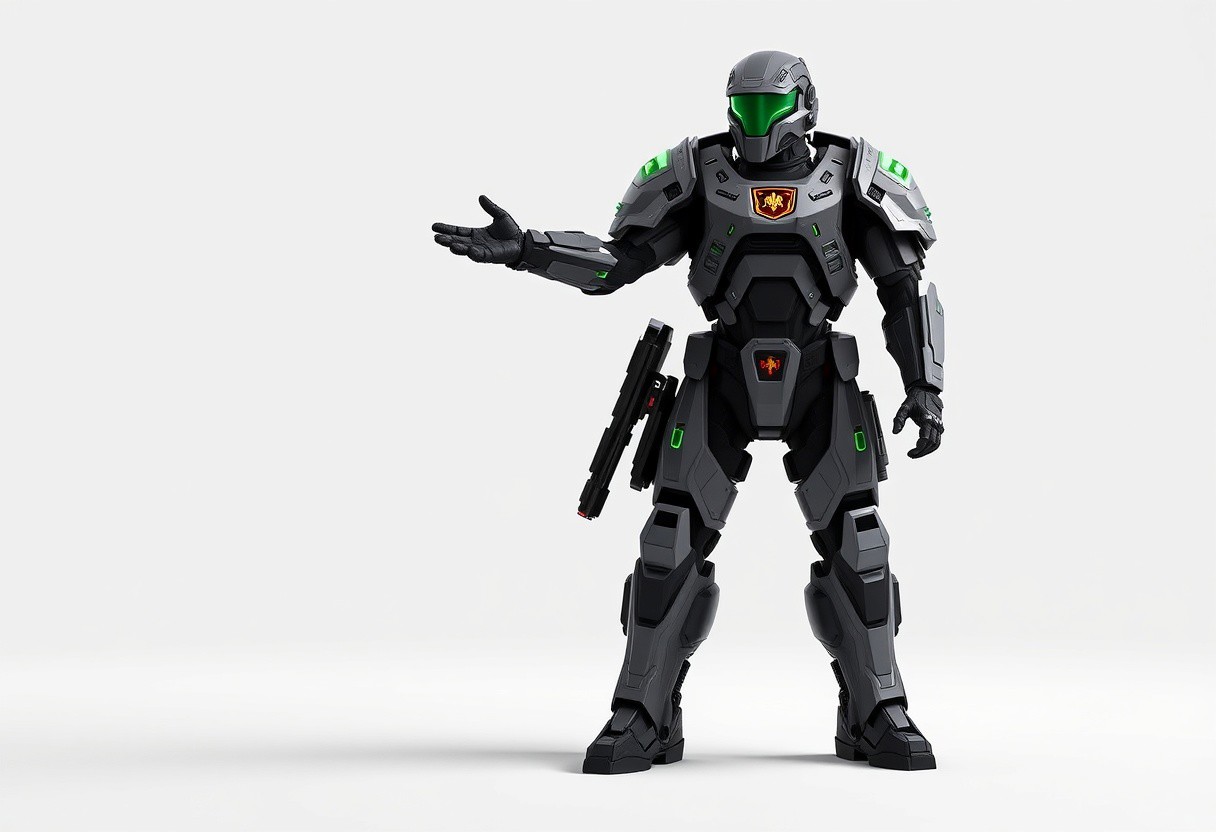 Sci-fi Gadget Soldier in high-tech combat armor, gray with striking green accents and black limbs, red & yellow chest emblem, helmet with green visor, standing ready, arms outstretched, legs slightly spread. Minimal white void background, poised in anticipation. Dynamic pose, cinematic volumetric lighting, Octane Render, Unreal Engine 5, CGSociety, trending on ArtstationHQ. Ultra-detailed, sharp focus, high quality, 4k, impeccable composition, creative angle, golden ratio.