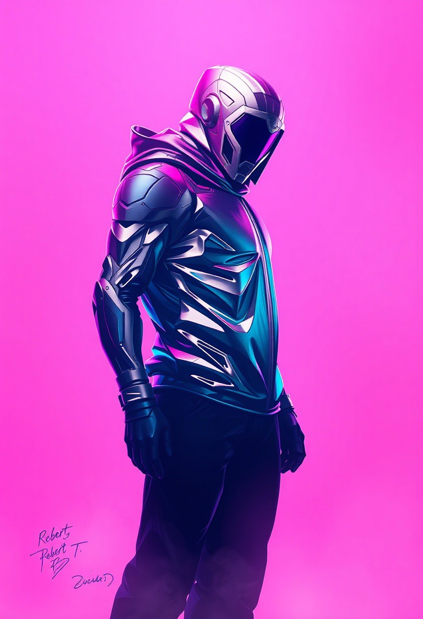 robert t techno style , Background: Clean, soft neon gradient with faint shadows and smudges, creating a stark contrast that emphasizes the character’s metallic textures and vibrant silhouette.