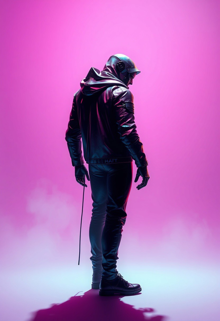 robert t techno style , Background: Clean, soft neon gradient with faint shadows and smudges, creating a stark contrast that emphasizes the character’s metallic textures and vibrant silhouette.