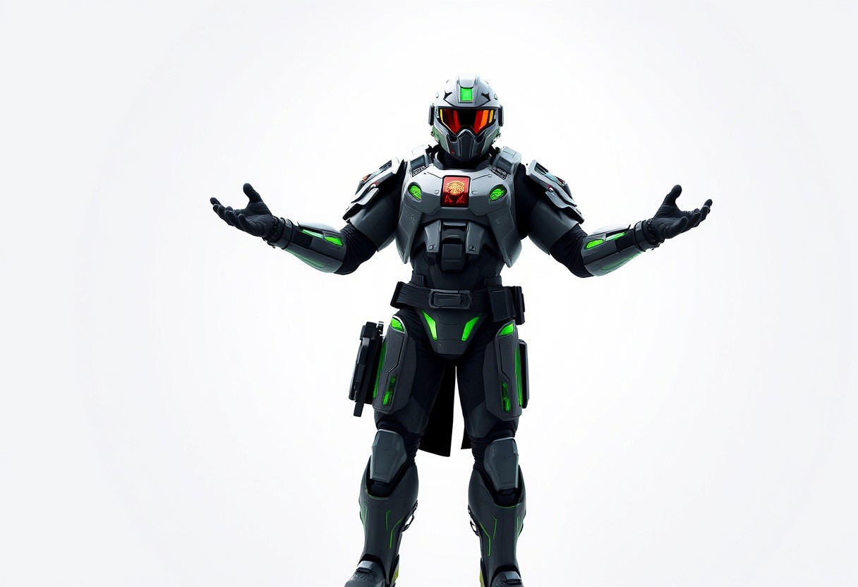 Sci-fi Gadget Soldier in high-tech combat armor, gray with striking green accents and black limbs, red & yellow chest emblem, helmet with green visor, standing ready, arms outstretched, legs slightly spread. Minimal white void background, poised in anticipation. Dynamic pose, cinematic volumetric lighting, Octane Render, Unreal Engine 5, CGSociety, trending on ArtstationHQ. Ultra-detailed, sharp focus, high quality, 4k, impeccable composition, creative angle, golden ratio.