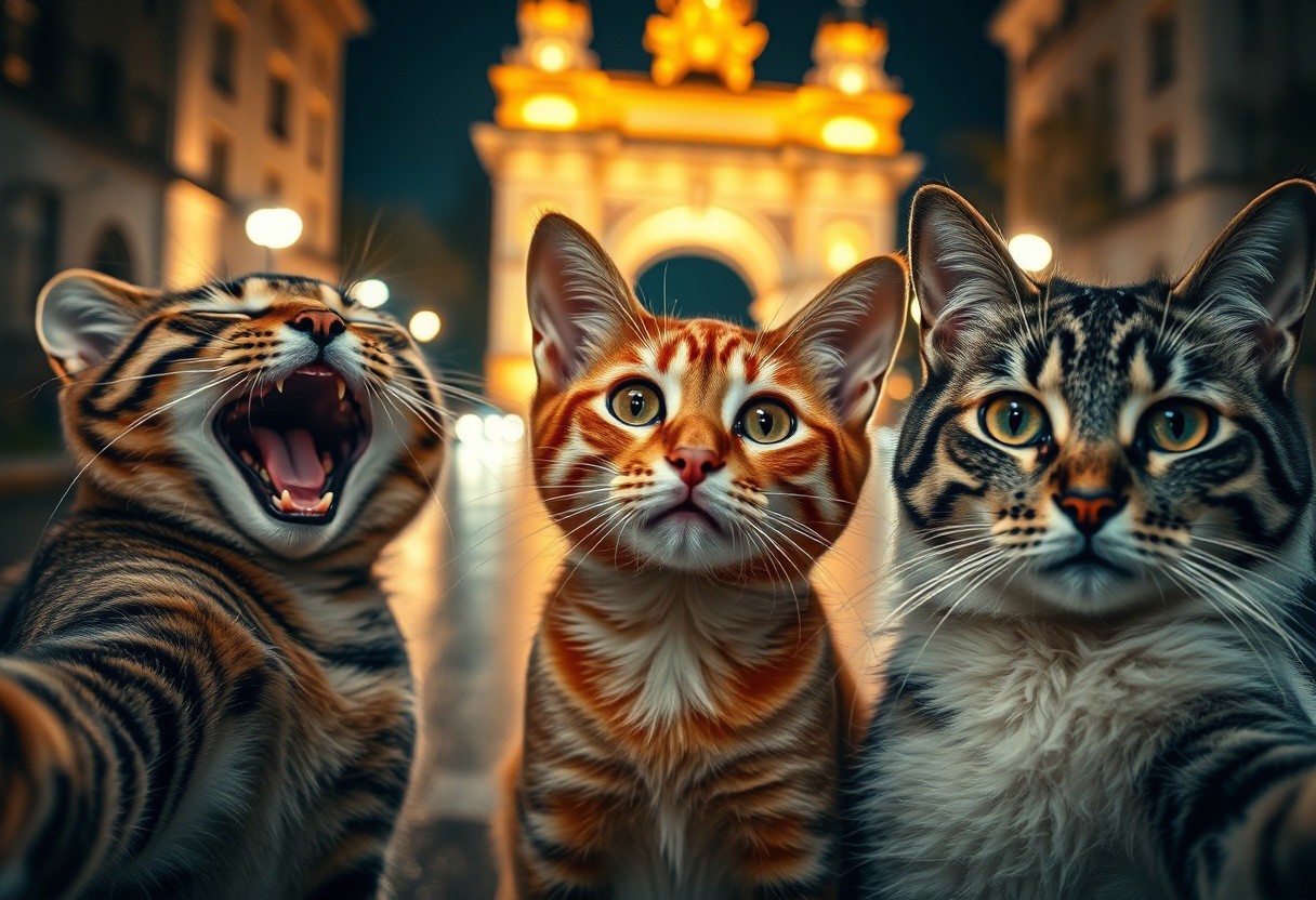 detailxl Photograph Taken on Nikon D750, Alphonse Mucha, 8K, athletic figure, Hyperdetailed, hyperrealism, Attractive, A dimly lit, rainy street at night, with soft streetlights A captivating close-up selfie of three domestic felines, taken at night with a prominent, warmly lit, iconic architectural structure in the soft-focus background. The cat on the left is a tabby, captured mid-laugh or enthusiastic meow, with its mouth wide open, conveying pure joy. The central cat, an orange tabby, looks directly at the viewer with wide, curious eyes and a slightly surprised or bewildered expression, its face perfectly framed. The cat on the right, a grey and white tabby, has a more serene and contemplative look, gazing calmly. The foreground is well-lit, highlighting the intricate fur details and distinct expressions of each cat. The background glow creates a beautiful bokeh effect, emphasizing the golden illumination of the distant landmark. The overall mood is whimsical and endearing, suggesting a playful and memorable moment shared by these furry companions." A soft, fading spark in the background symbolizes the lost hope and emotions fading away. The overall color palette should be cool tones, with shades of blue, gray, and a touch of warm amber from the streetlights.
