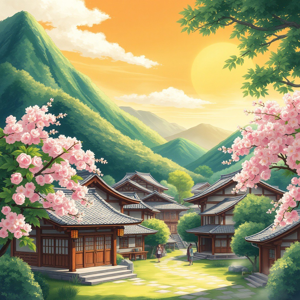 A serene anime-inspired village scene set amidst lush green mountains, with traditional Japanese-style houses featuring curved tiled roofs, paper lanterns, and sliding doors made of natural wood, surrounded by lush trees with blooming cherry blossoms in shades of pink and white, against a warm sunny sky with a few wispy clouds, rendered in a vibrant watercolor style with bold brushstrokes and delicate textures, evoking a sense of tranquility and harmony with nature, with maybe a few villagers in the distance, dressed in traditional attire, going about their daily lives, with subtle hints of mist and fog hovering around the village, giving it an enchanting and mystical atmosphere.