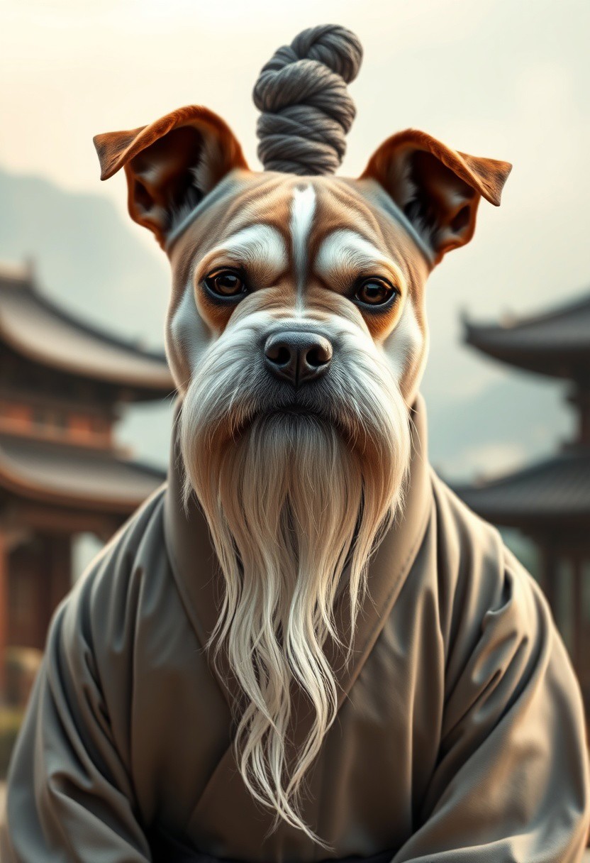 A photorealistic portrait of a dog with a flat, squashed face, styled like a martial arts master. The dog has a long flowing white beard extending far below its chin, large bushy white eyebrows, and long sideways white whiskers. On top of its head is a traditional topknot bun, resembling Pai Mei from Kill Bill. The dog is wearing traditional East Asian monk robes in neutral tones, with a black sash. It stares directly into the camera with a calm, superior expression. The background is a misty mountain temple scene with warm natural lighting. Vertical 9:16 aspect ratio.