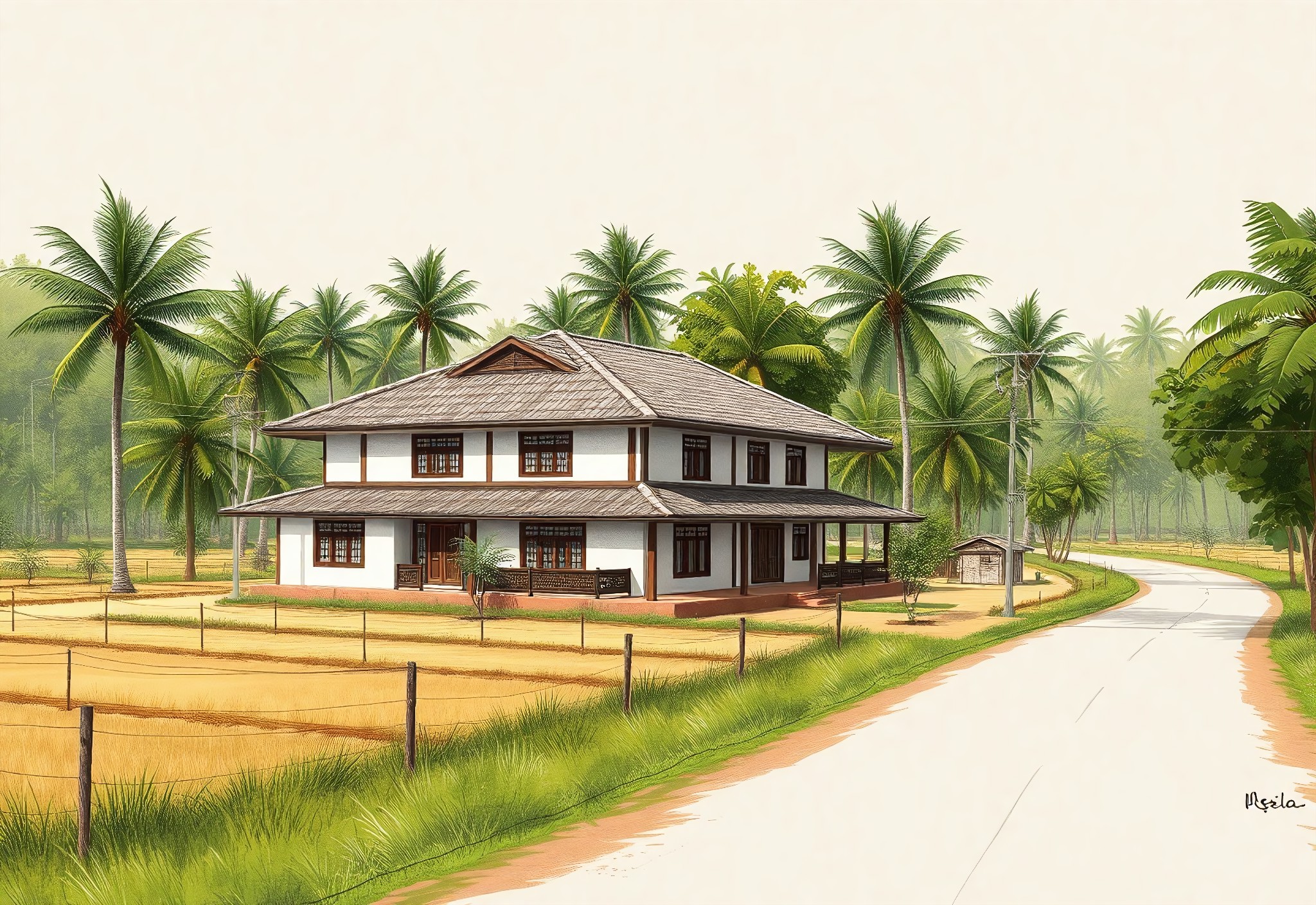 (Ultra-realistic, 32k, Masterpiece, High Quality, Detailed Realistic Background, Official Art, Realistic Lighting, filmfotos). Sketch design, illustrator art, hyper detail architecture design sketch. Japandi house, two stories farmhouse, Nearby farmland and garden. Direction connected road. Surrounded by Tropical trees. 60% Primary: Dusty Gray, Taupe. 30% Secondary: Lime Green, Dark Green, Saddle Brown. 10% Accent: Light Salmon, Pale Cyan, Brick Red.