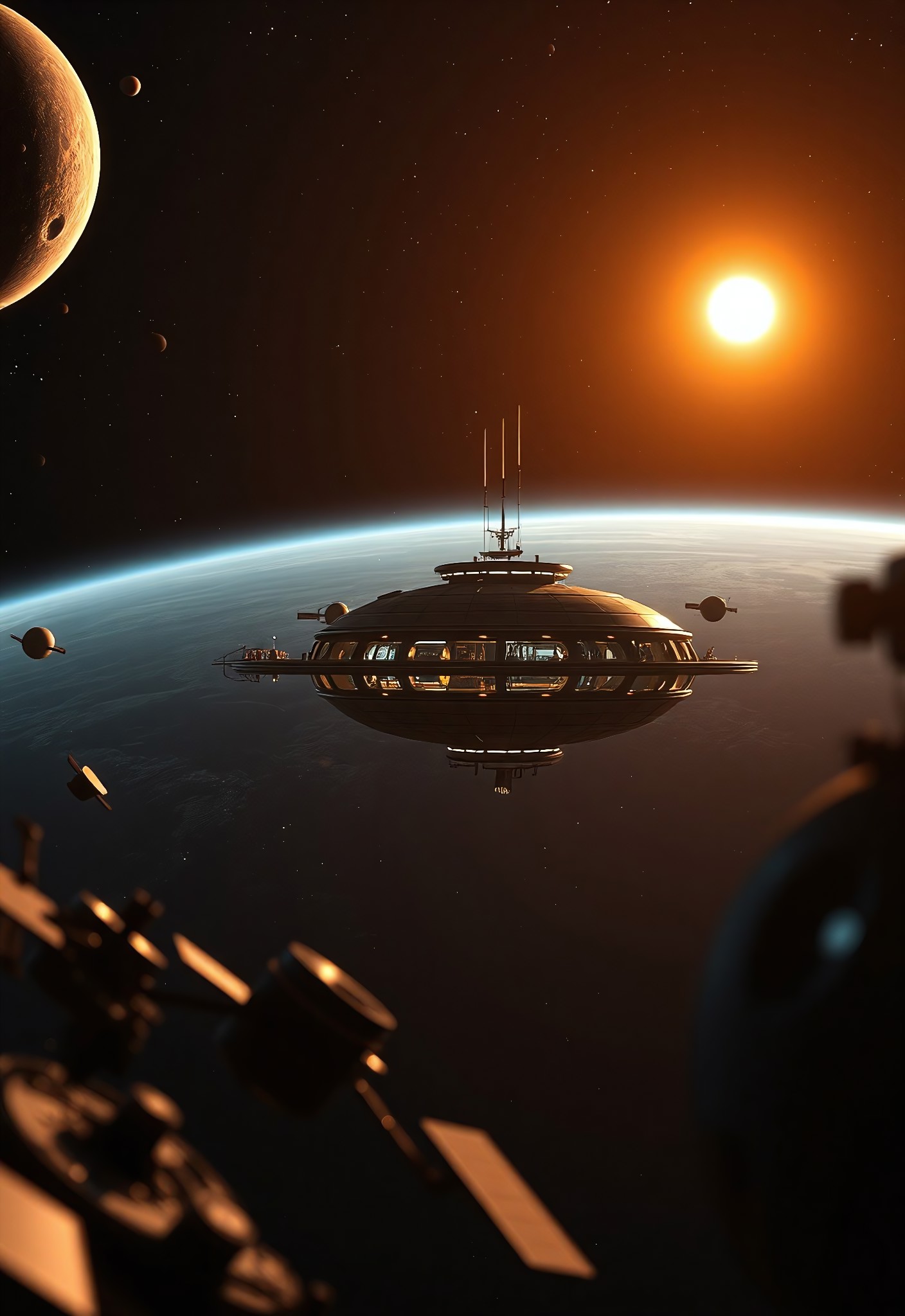 Foreground: satellites. Focus Midground: Floating Space station in Futuristic Lighting Eco Habitat, Cylindrical Habitat station. Background: shining Solar. Solar system, Mars, Jupiter, Saturn, Neptune, Uranus, Kuipler belt, Heliopause, Heliosphere. Realistic lighting cinematic scene, Space Odyssey.