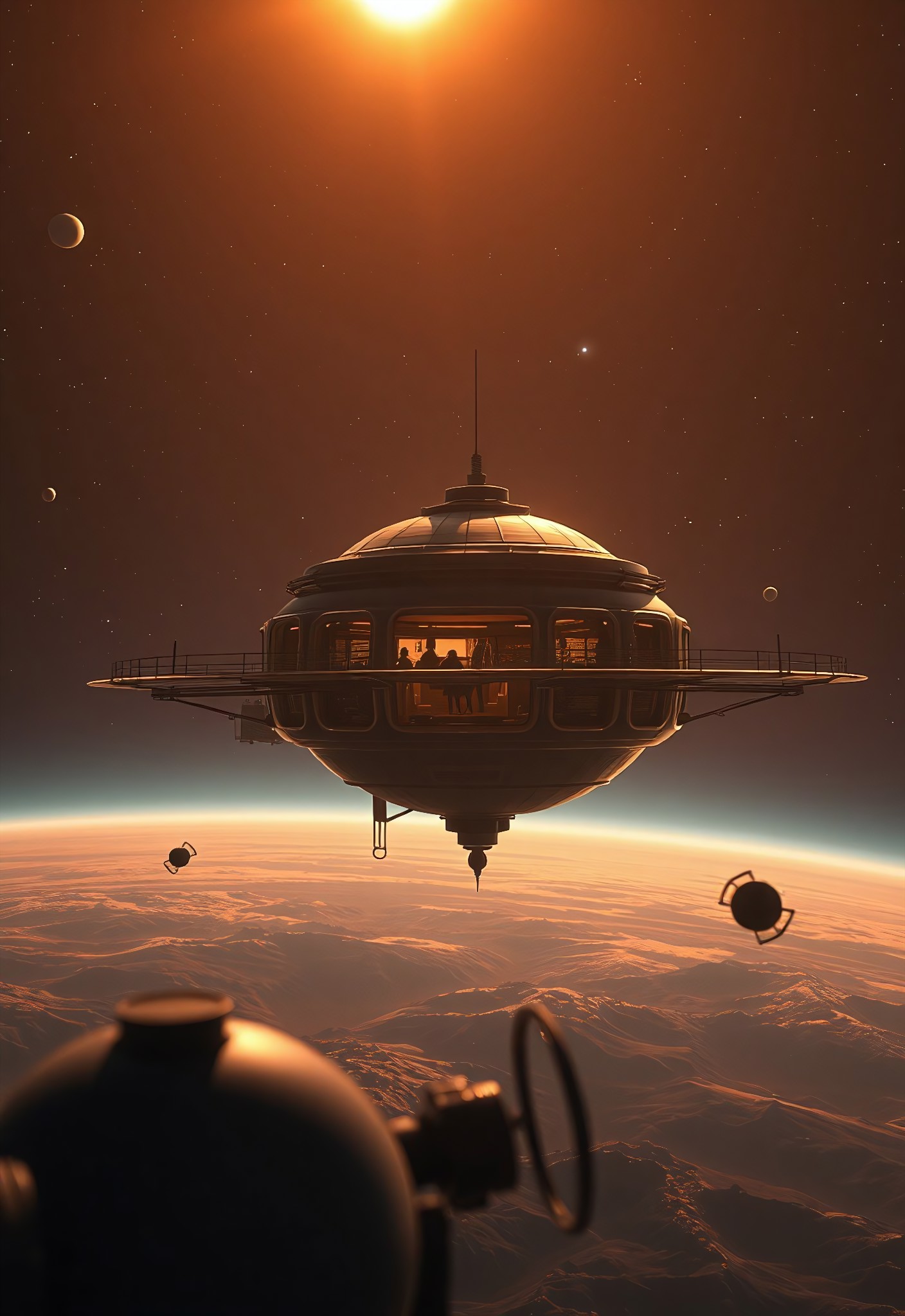 Foreground: satellites. Focus Midground: Floating Space station in Futuristic Lighting Eco Habitat, Cylindrical Habitat station. Background: shining Solar. Solar system, Mars, Jupiter, Saturn, Neptune, Uranus, Kuipler belt, Heliopause, Heliosphere. Realistic lighting cinematic scene, Space Odyssey.