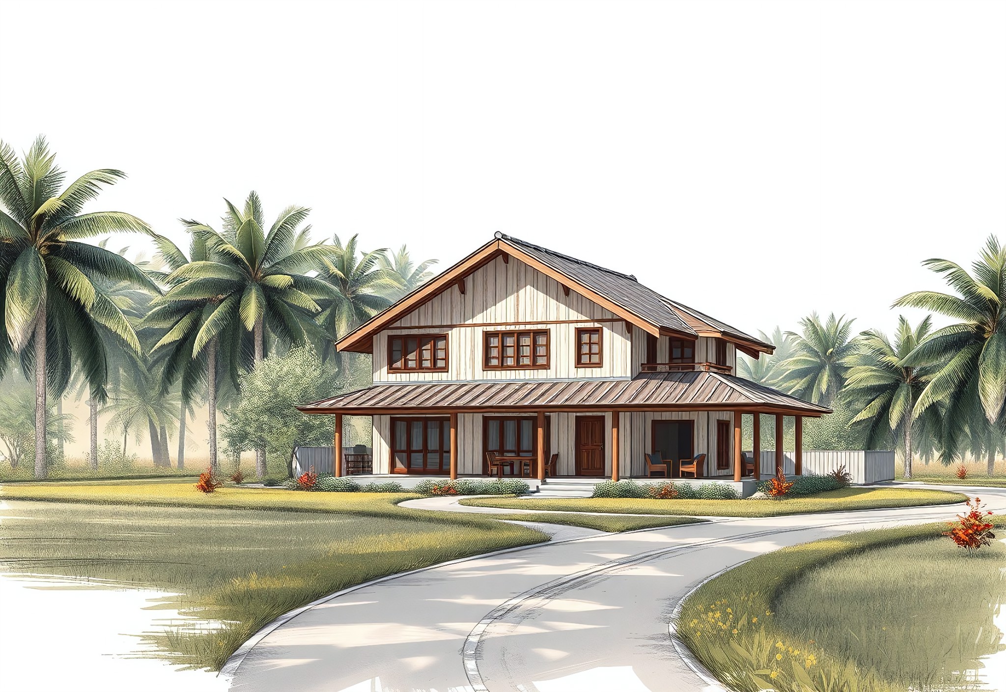 (Ultra-realistic, 32k, Masterpiece, High Quality, Detailed Realistic Background, Official Art, Realistic Lighting, filmfotos). Sketch design, illustrator art, hyper detail architecture design sketch. Japandi house, two stories farmhouse, Nearby farmland and garden. Direction connected road. Surrounded by Tropical trees. 60% primary color: Warm Cream, Soft Light Wood 30% secondary color: Charcoal Gray, Rich Mahogany 10% accent color: Dusty Coral, Matte Black, Burnt Orange