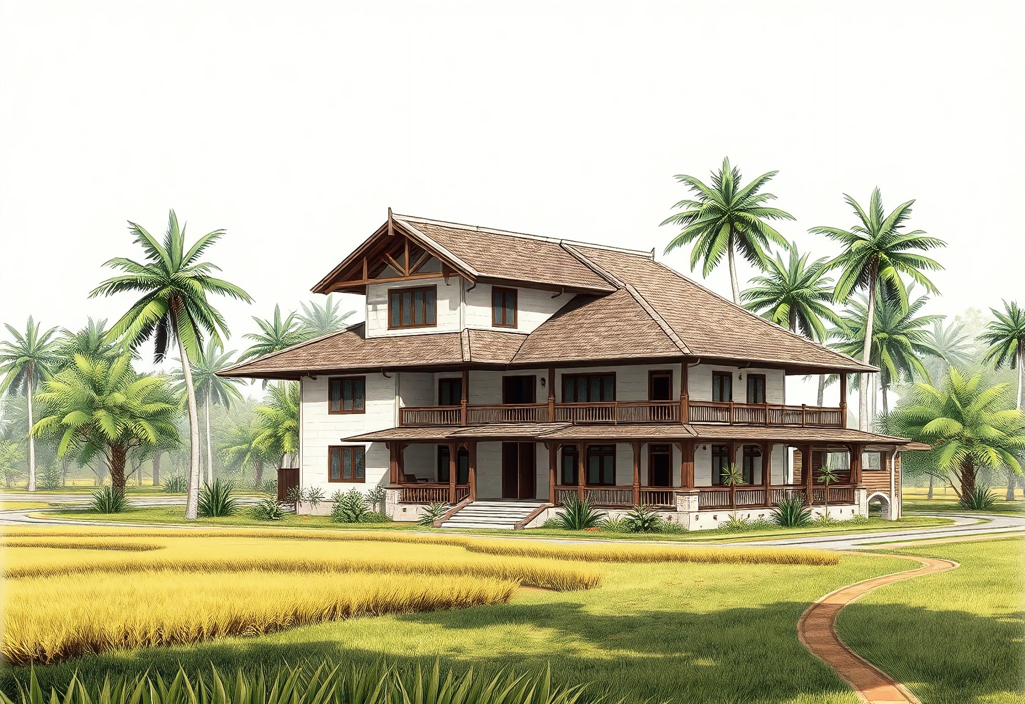 (Ultra-realistic, 32k, Masterpiece, High Quality, Detailed Realistic Background, Official Art, Realistic Lighting, filmfotos). Sketch design, illustrator art, hyper detail architecture design sketch. Japandi house, two stories farmhouse, Nearby farmland and garden. Direction connected road. Surrounded by Tropical trees. 60% Primary: Dusty Gray, Taupe. 30% Secondary: Lime Green, Dark Green, Saddle Brown. 10% Accent: Light Salmon, Pale Cyan, Brick Red.