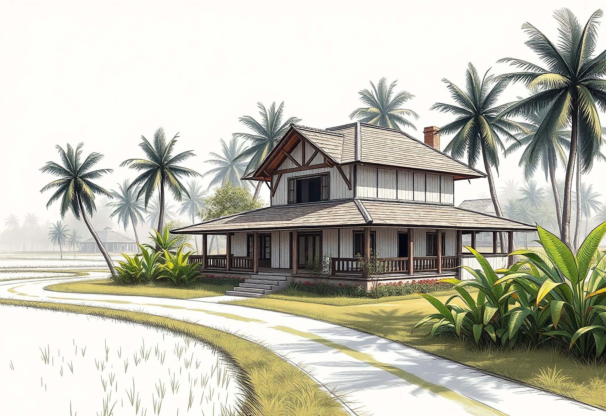 (Ultra-realistic, 32k, Masterpiece, High Quality, Detailed Realistic Background, Official Art, Realistic Lighting, filmfotos). Sketch design, illustrator art, hyper detail architecture design sketch. Japandi house, two stories farmhouse, Nearby farmland and garden. Direction connected road. Surrounded by Tropical trees. 60% Primary: Dusty Gray, Taupe. 30% Secondary: Lime Green, Dark Green, Saddle Brown. 10% Accent: Light Salmon, Pale Cyan, Brick Red.