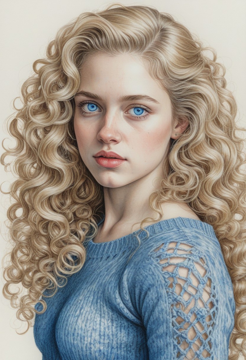 3/4 Portrait of a young woman, long curly hair, blonde hair, hair swept to one side, blue eyes, perfect figure, small chest, knitted sweater, 2/3 face angle, post-processing rendering, Oil Ink drawing, rococo, ink and watercolour, high colour saturation, masterpiece, surrealism, ultra detailed, high resolution