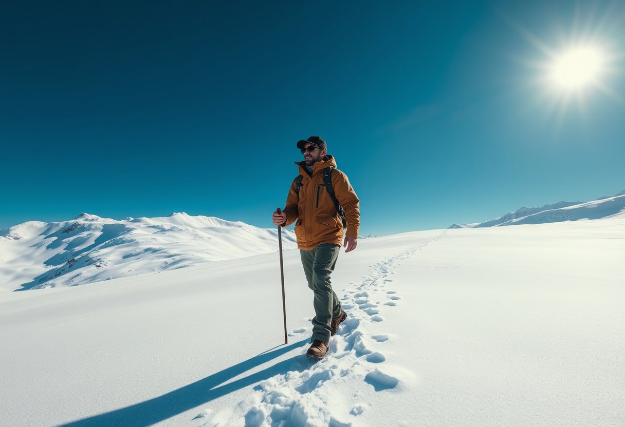 A solitary man chad in weathered brown jacket, green pants, black hat, sunglasses, holding a walking stick, treks right across a vast, pristine snowy mountain under deep blue sky. Harsh sun glare on snow, detailed footprints trail behind. Cinematic lighting, octane render, beautiful matte painting, contemporary aesthetics, high-resolution, lifelike details, impeccable composition, trending on ArtstationHQ.