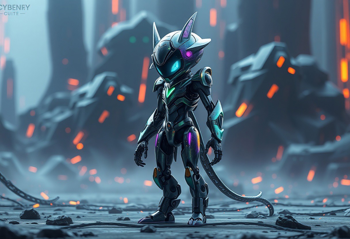 A single Cyberse Witch robot, crafted details from iridescent Cyberdark material, standing poised, ready for action, head tilted slightly, within a sprawling Cyberdark Realm. Vibrant, playful form, emanating solitude. High detail, impeccable composition, creative angle, cinematic lighting, sharp lines, harmonious colors. Splash Ink Illustration, Matte Painting, Octane render, Unreal Engine 5, 4K, 8K, CGSociety, trending on Artstation, Golden Ratio.