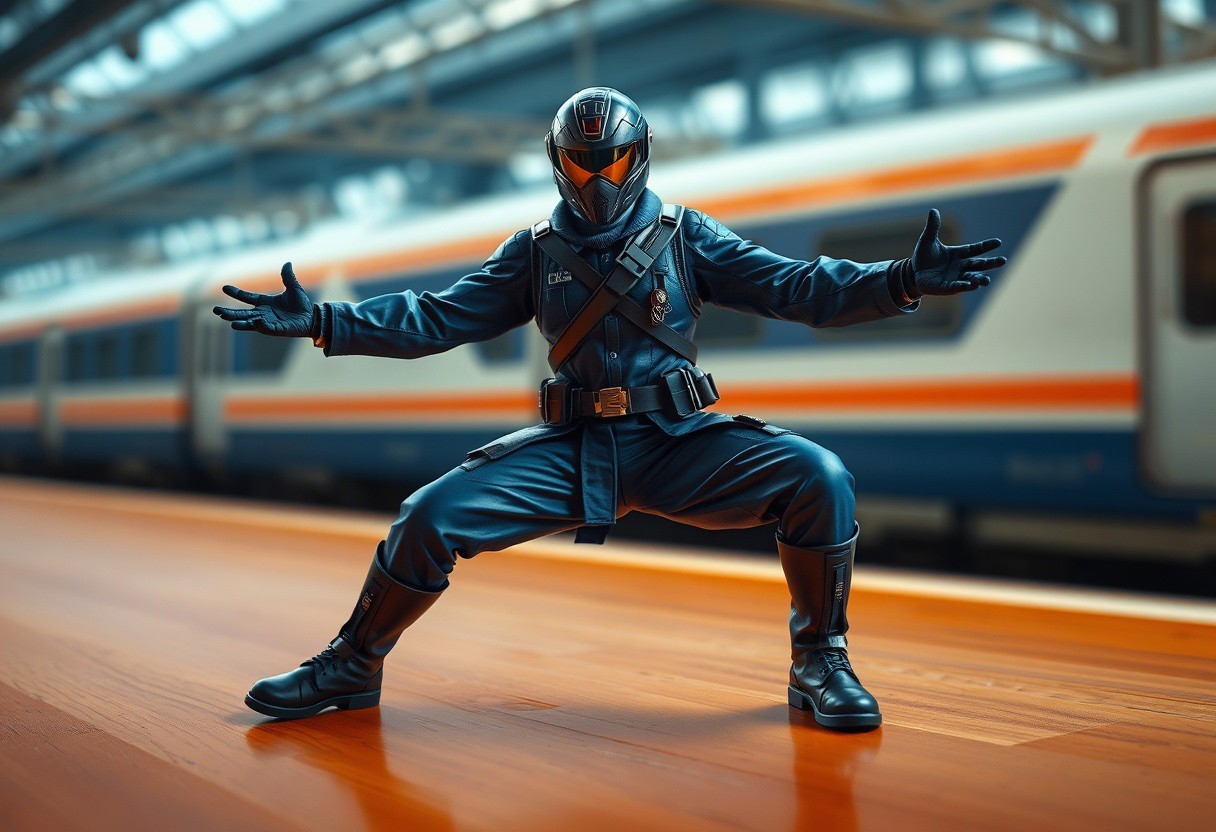 Agent of Judgment warrior on warm wooden surface. Dynamic pose, outstretched arms, legs apart. Blue uniform, black helmet visor, belt, boots. Super Express Bullet Train in background. Ultra-detailed collectible photograph, sharp focus, cinematic studio lighting, macro shot, photorealistic, trending on Artstation, cgsociety.