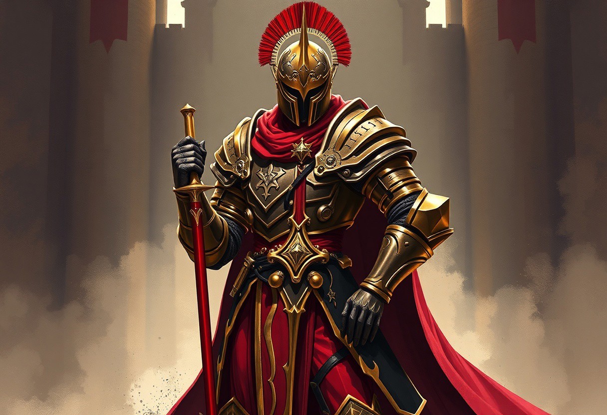 4K high-res digital illustration, powerful Noble Knight's Spearholder in grand red and gold armor with black/silver accents, plumed helmet. Ready stance, hand on hip, gripping red/gold/black sword.Castle of Dragon Souls background, dynamic shadow. Captivating lighting, golden ratio composition. Matte painting, splash ink illustration style. Trending on Artstation, CGSociety. Octane Render, Unreal Engine 5. Super detailed armor and sword.