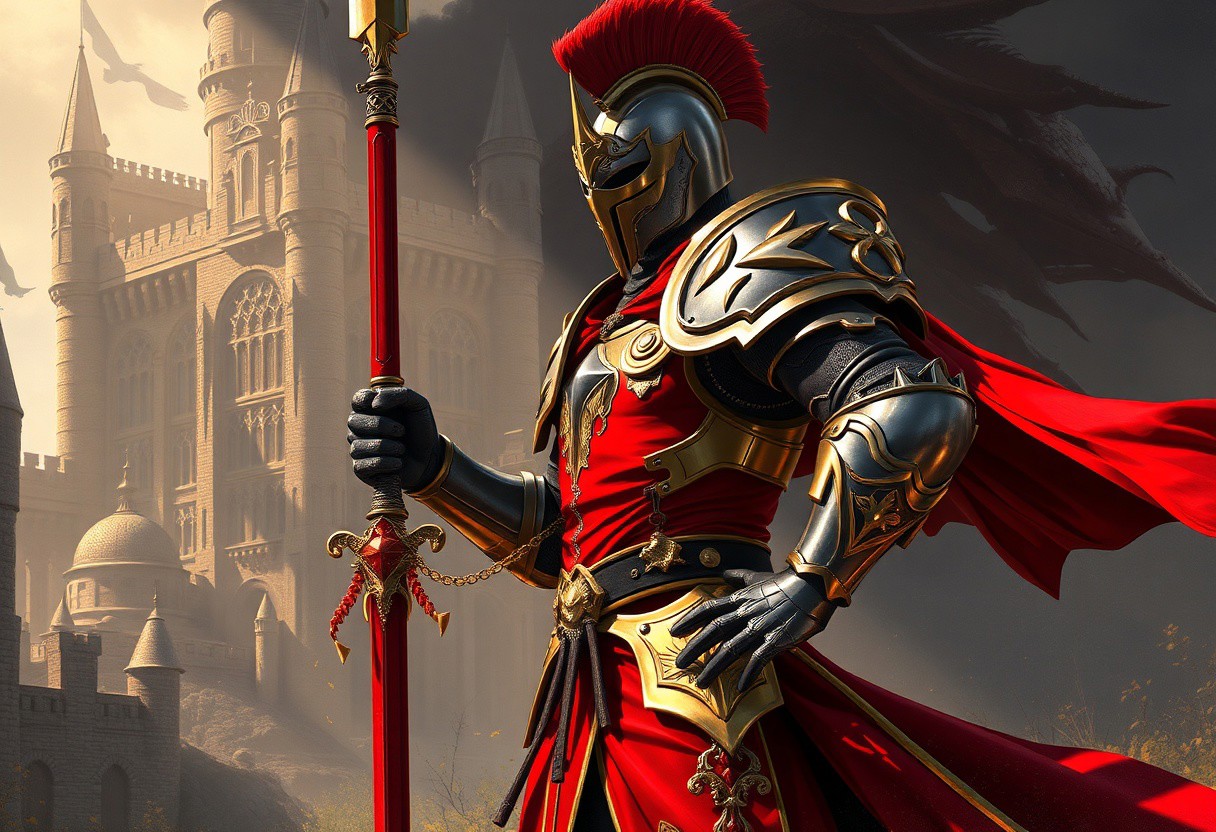 4K high-res digital illustration, powerful Noble Knight's Spearholder in grand red and gold armor with black/silver accents, plumed helmet. Ready stance, hand on hip, gripping red/gold/black sword.Castle of Dragon Souls background, dynamic shadow. Captivating lighting, golden ratio composition. Matte painting, splash ink illustration style. Trending on Artstation, CGSociety. Octane Render, Unreal Engine 5. Super detailed armor and sword.