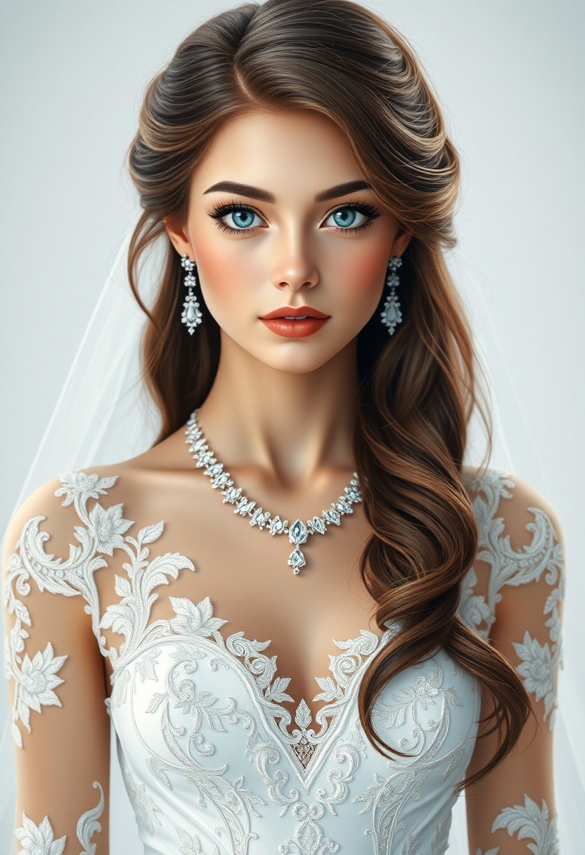 A full-body fotorealistic image of a 20-year-old girl with long hair styled in an elegant wedding hairstyle. She has striking blue eyes and is wearing a beautiful white wedding dress adorned with delicate details. Her look is completed with elegant jewelry, enhancing the sophistication of the bridal design. The style is clean, detailed, and focused on showcasing the elegance and flow of the dress and accessories in a fashion illustration style.