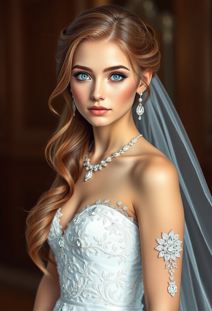 A full-body fotorealistic image of a 20-year-old girl with long hair styled in an elegant wedding hairstyle. She has striking blue eyes and is wearing a beautiful white wedding dress adorned with delicate details. Her look is completed with elegant jewelry, enhancing the sophistication of the bridal design. The style is clean, detailed, and focused on showcasing the elegance and flow of the dress and accessories in a fashion illustration style.