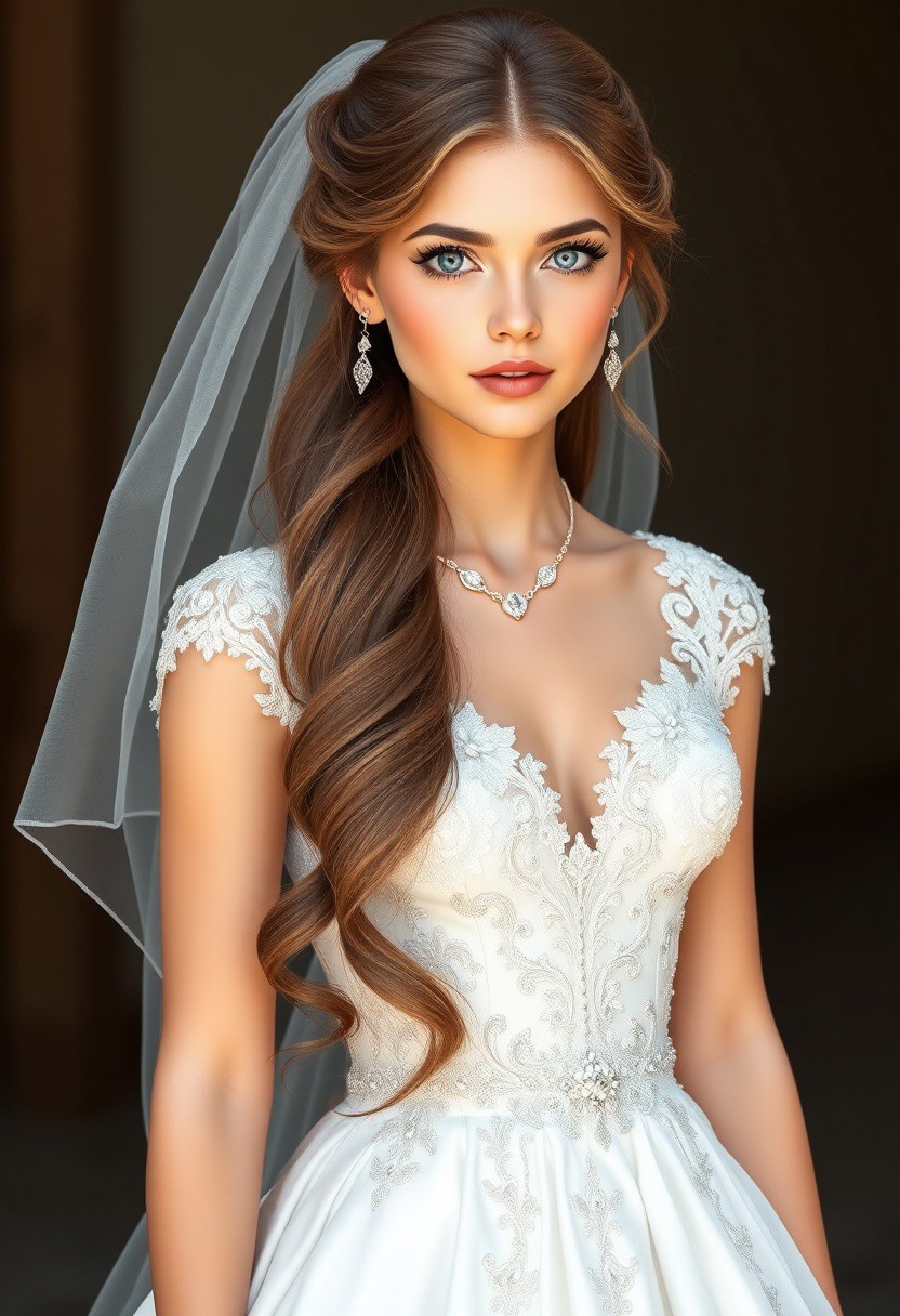 A full-body fotorealistic image of a 20-year-old girl with long hair styled in an elegant wedding hairstyle. She has striking blue eyes and is wearing a beautiful white wedding dress adorned with delicate details. Her look is completed with elegant jewelry, enhancing the sophistication of the bridal design. The style is clean, detailed, and focused on showcasing the elegance and flow of the dress and accessories in a fashion illustration style.