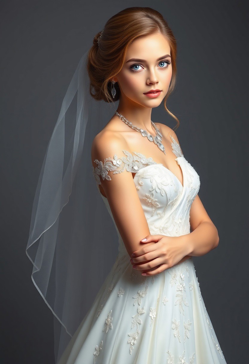A full-body fotorealistic image of a 20-year-old girl with long hair styled in an elegant wedding hairstyle. She has striking blue eyes and is wearing a beautiful white wedding dress adorned with delicate details. Her look is completed with elegant jewelry, enhancing the sophistication of the bridal design. The style is clean, detailed, and focused on showcasing the elegance and flow of the dress and accessories in a fashion illustration style.